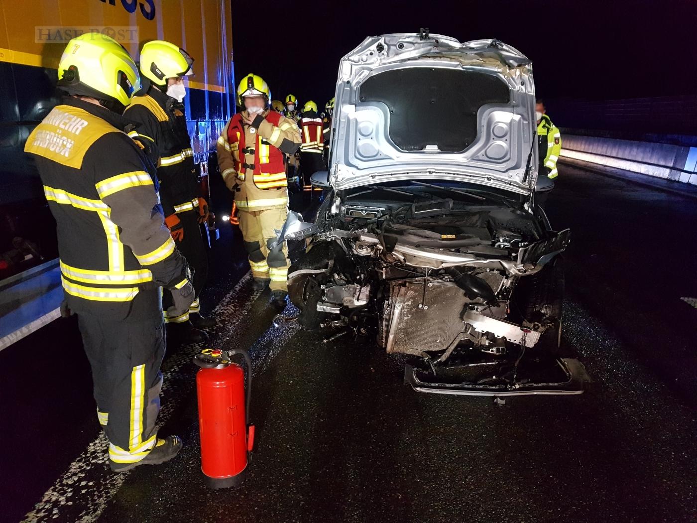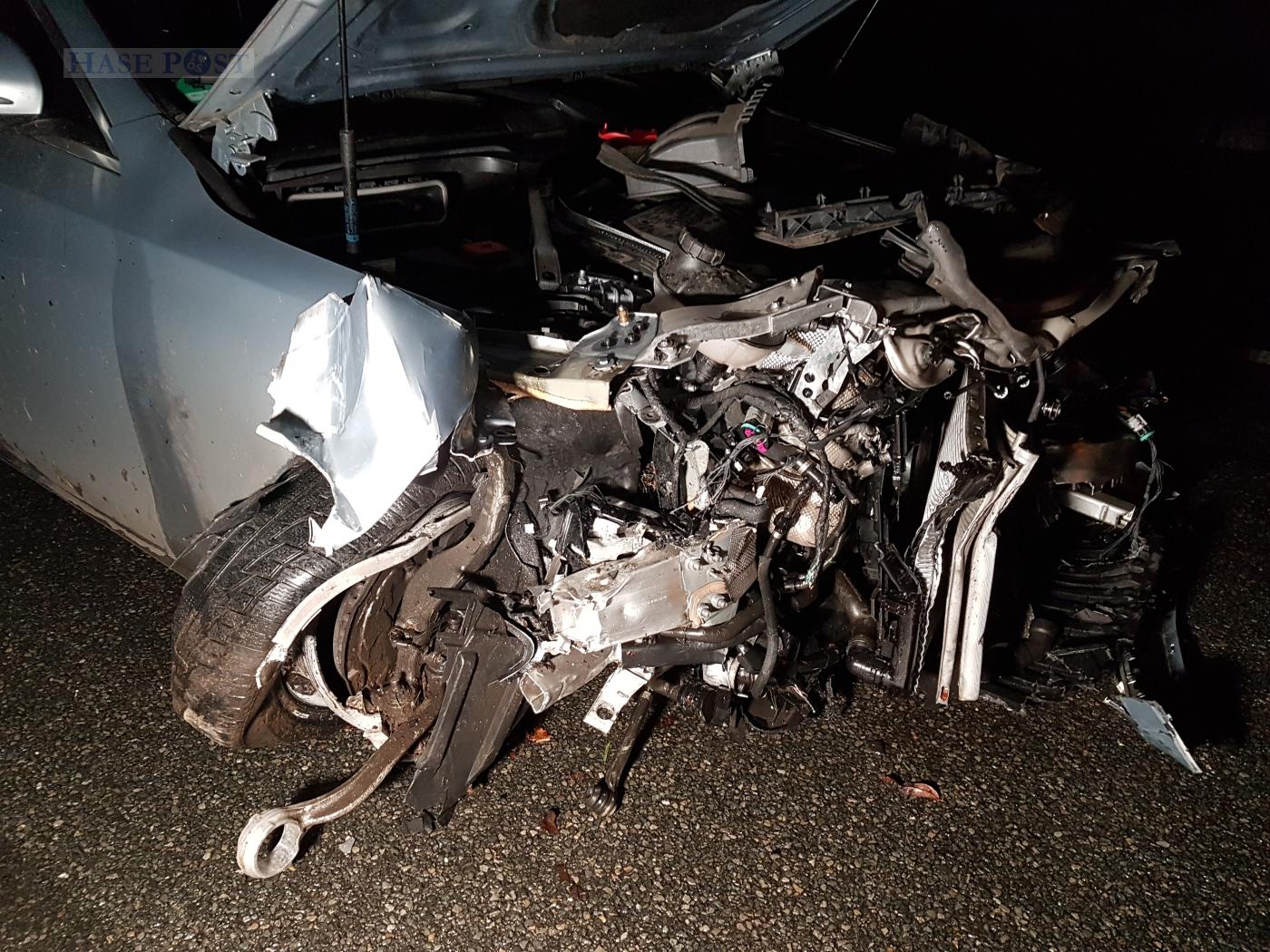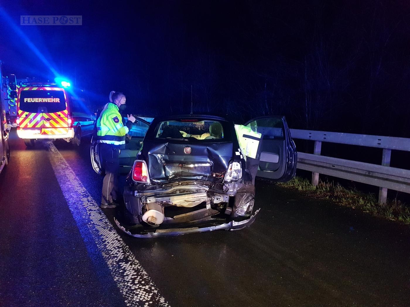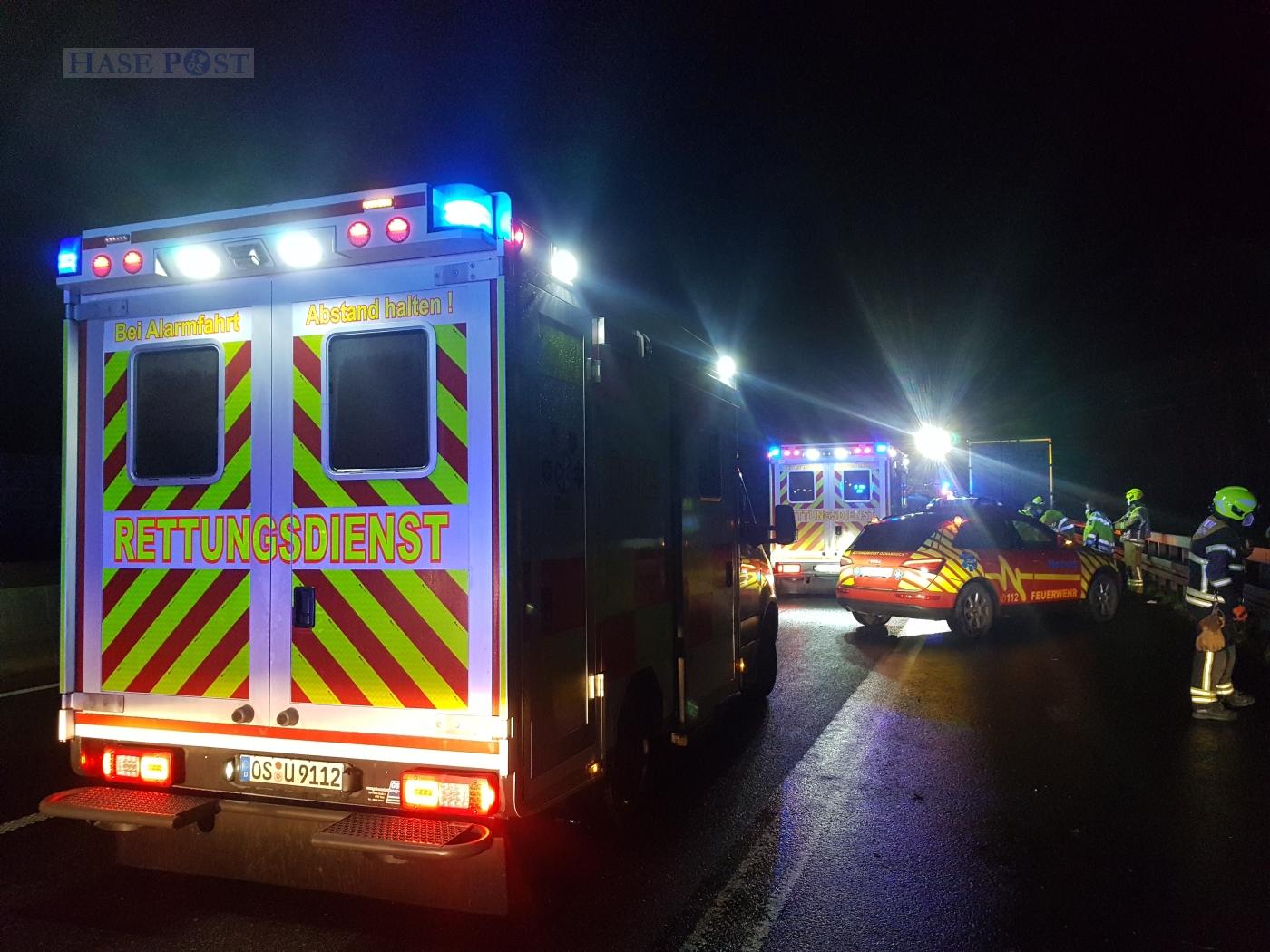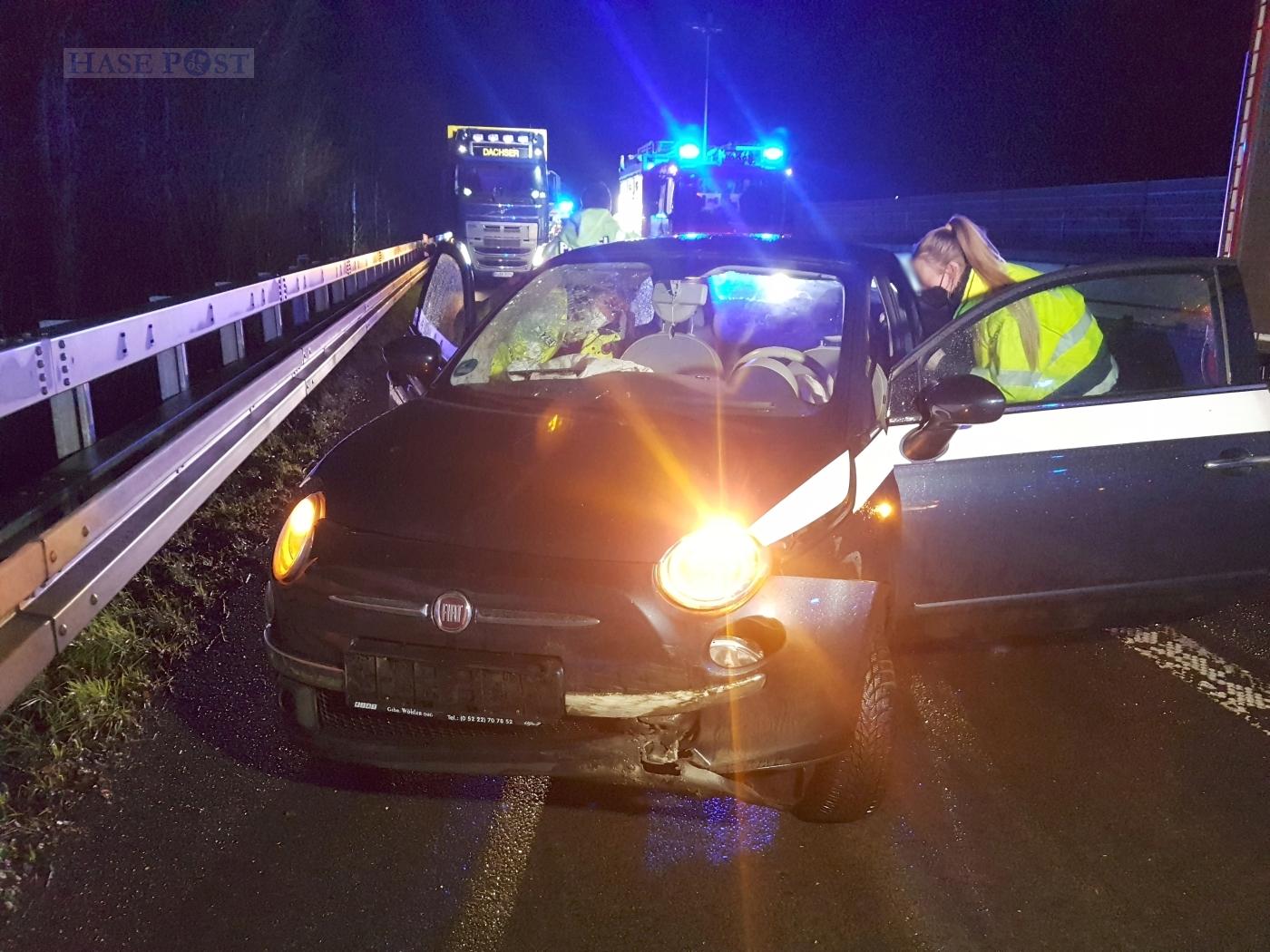 Gegen 0:55 Uhr wurden die Rettungskräfte zur Unfallstelle zwischen dem Kreuz Osnabrück-Süd und der Abfahrt Natbergen gerufen. Dort waren zwei Autos kollidiert. Nach ersten Aussagen hatte der junge Fahrer einer Mercedes Limousine auf dem Überholfahrstreifen die Kontrolle über seinen Wagen verloren.