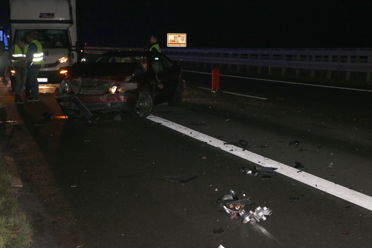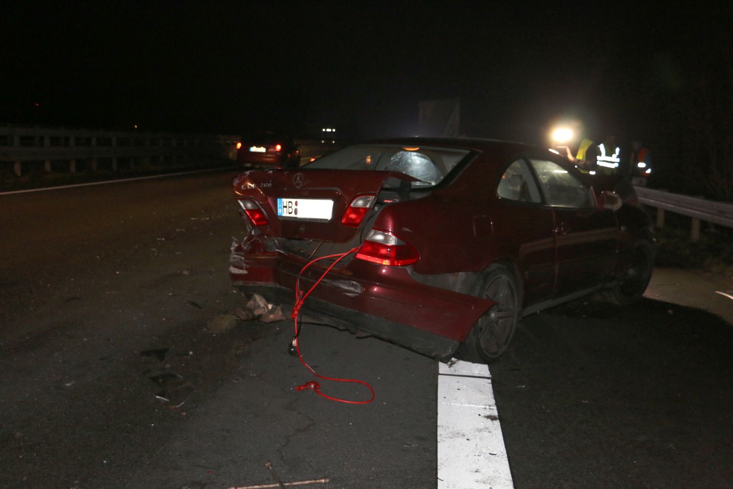 Gegen 23:20 Uhr befuhren zunächst eine Mercedes Limousine sowie ein Transporter die Autobahn A30 zwischen Melle-West und Gesmold in Richtung Osnabrück. Der Mercedes soll dabei mit ca. 80 km/h unterwegs gewesen sein, als der Transporter auf diesen auffuhr und ihn dadurch in die Leitplanke schleuderte. Der Mercedes wurde stark beschädigt, beide Fahrzeuge kamen danach auf dem Hauptfahrstreifen zum Stehen.