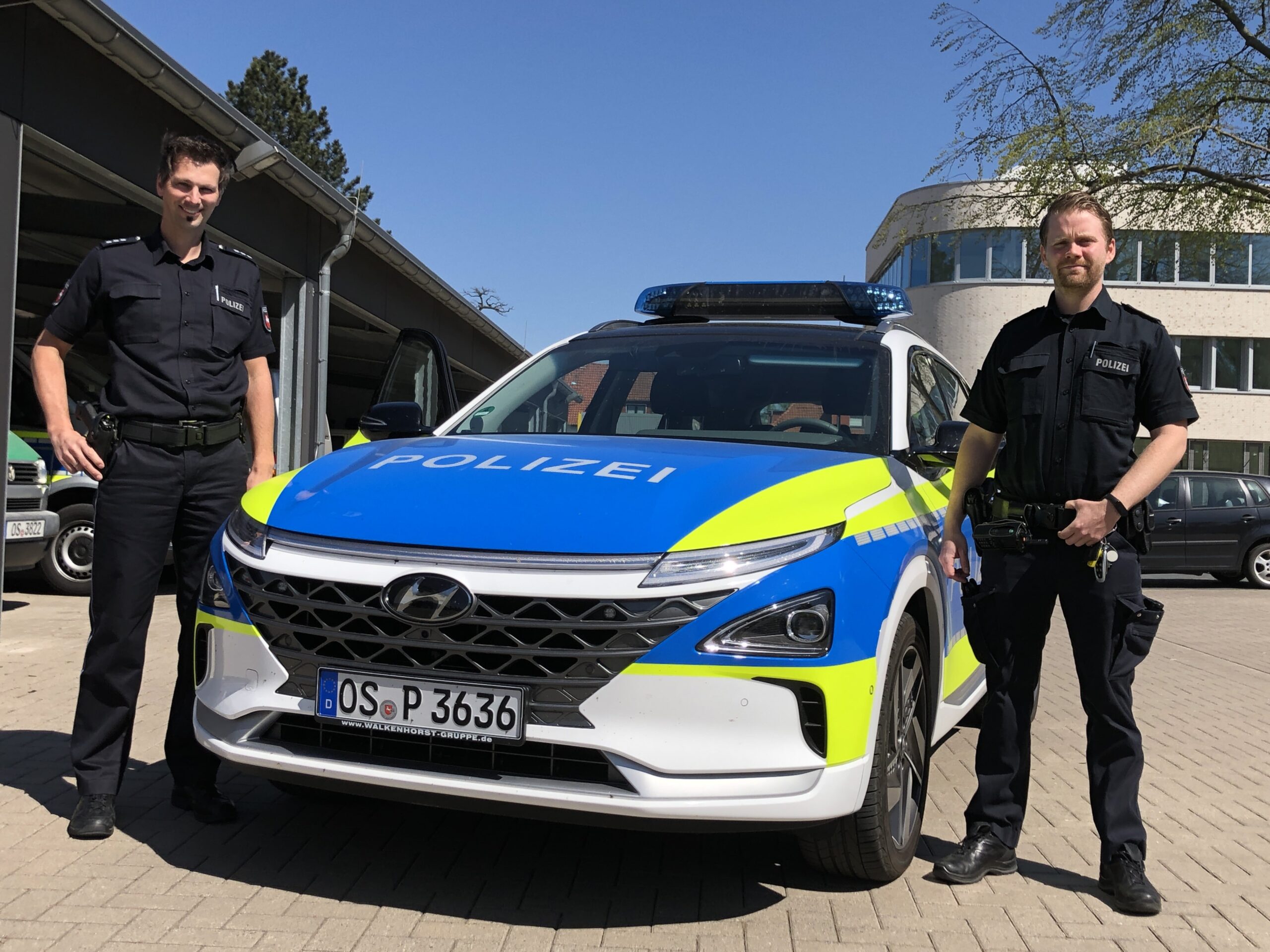 Die Polizeidirektion Osnabrück geht bei ihrem vor gut drei Jahren eingeschlagenen Weg, die eigene Mobilität nach Hybrid- und Elektroantrieb umweltfreundlicher und nachhaltiger zu gestalten, nun einen weiteren, innovativen Weg: Als eine der ersten Polizeibehörden in Deutschland ist neben Berlin nun auch in Osnabrück ein Wasserstoff-Streifenwagen mit 100 Prozent Brennstoffzellentechnik im Einsatz. Das lokal CO2 freie Fahrzeug mit seiner alternativen Antriebstechnologie wird für ein Jahr im Einsatz- und Streifendienst auf seine Alltagstauglichkeit hin getestet. Eine ursprünglich vorgesehene offizielle Vorstellung des Fahrzeuges gemeinsam mit Innenminister Boris Pistorius und Polizeipräsident Michael Maßmann wurde wegen der Corona-Problematik abgesagt. Das Projekt der Polizeidirektion Osnabrück wird im Rahmen des Nationalen Innovationsprogramms Wasserstoff- und Brennstoffzellentechnologie mit insgesamt 20.460 Euro durch das Bundesministerium für Verkehr und digitale Infrastruktur gefördert. Die Förderrichtlinie wird von der NOW GmbH koordiniert und durch den Projektträger Jülich (PtJ) umgesetzt.