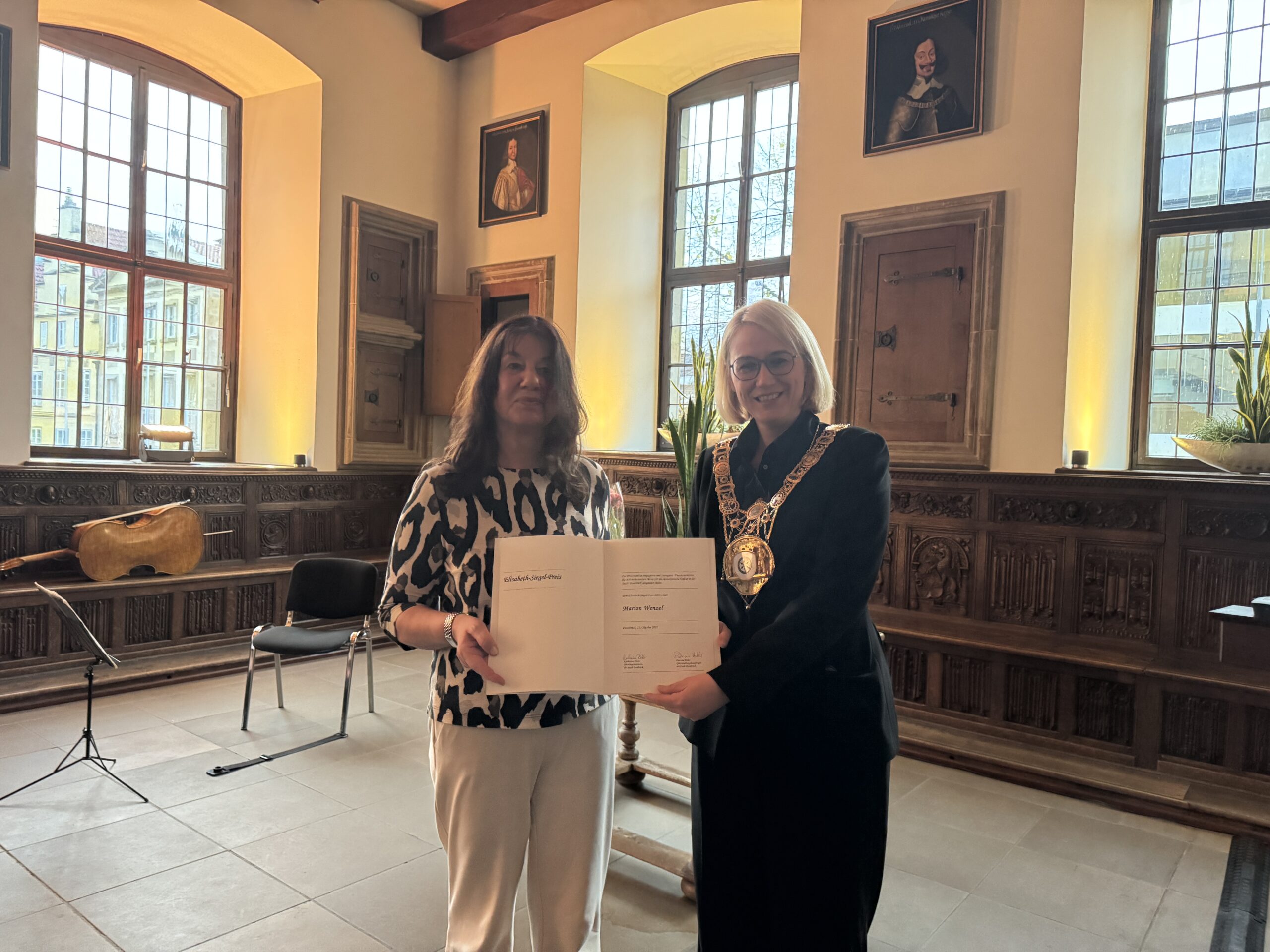 Mit einer bewegenden musikalischen Einlage eröffnete Angelika Bönisch die Veranstaltung am späten Donnerstagnachmittag (23. Oktober), bevor Oberbürgermeisterin Katharina Pötter an das Podium im Friedenssaal des historischen Rathauses trat. Sie erinnerte alle Anwesenden daran, dass der Schutz und die Gleichberechtigung von Frauen gerade in der heutigen Zeit wichtiger ist denn je. Erst im Juni ereignete sich ein Femizid im Stadtteil Schinkel, direkt vor unserer Haustür, so Pötter, und macht somit auf erschütternde Art und Weise deutlich, dass die Arbeit von Marion Wenzel und ihren engagierten Kolleginnen im Frauenhaus leider nach wie vor nötig ist.