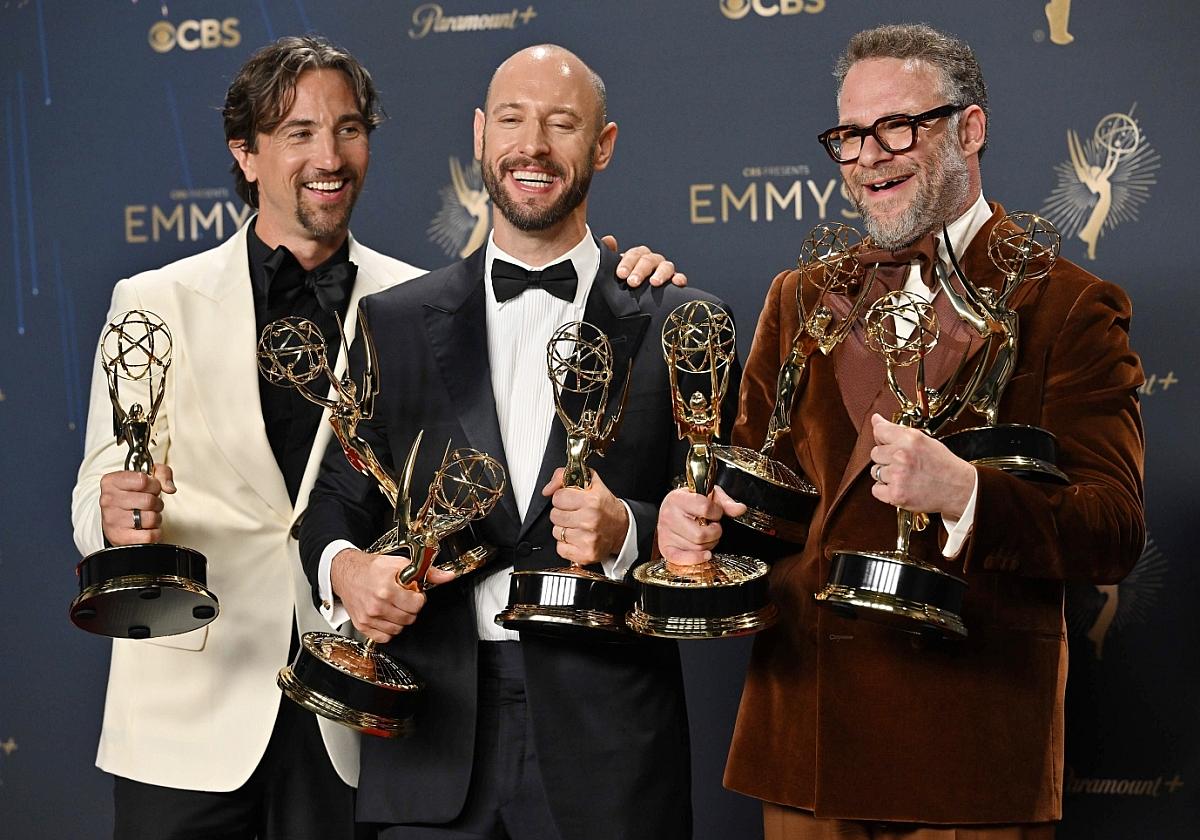 James Weaver, Evan Goldberg und Seth Rogen mit ihren Emmys am 14.09.2025 / Chis Chew/Upi/ddp, via dts Nachrichtenagentur