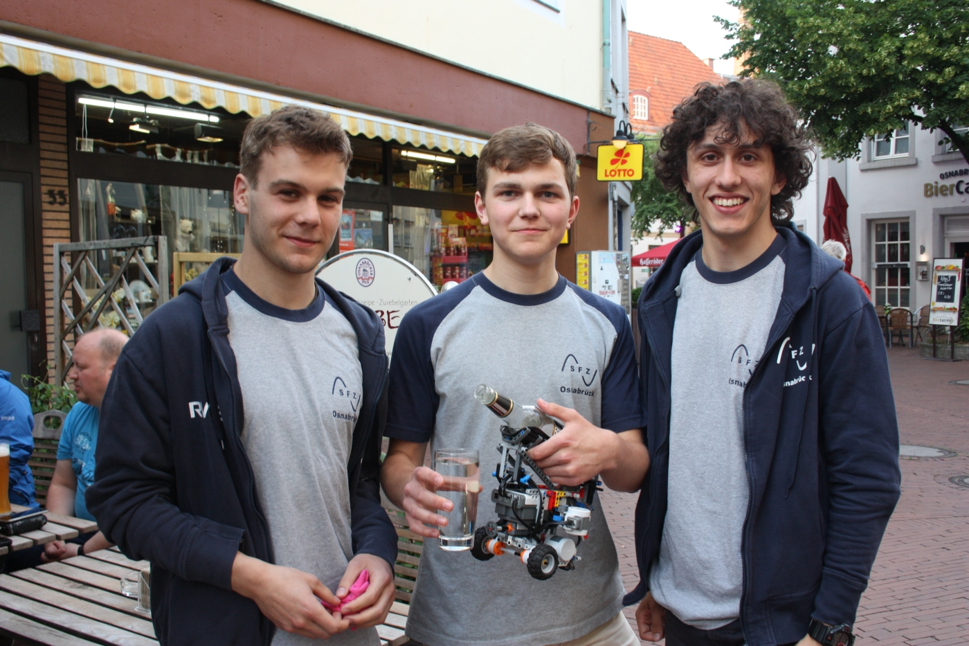 Fiete Breer, Jakob Renard und Julius Beckmann vom Schüler-Forschungs-Zentrum Osnabrück e.V. stellten einen Roboter vor, der autonom Bier aus Flaschen in Gläser einschenkt und dabei auch den richtigen Abstand zum Glas selbständig einnimmt. „Bis zum fertigen Produkt müssten wir wohl noch etwas weiterentwicklen. Bei Schaumbildung müsste der Roboter zum Beispiel noch schrittweises Nachschenken beherrschen.“, so Robotiker Jakob. Dennoch sehen die drei Vorteile darin, wenn ein Roboter Getränke einschenken kann. „Bei der WM könnte dann jeder in Ruhe das Spiel gucken, der Biernachschub würde automatisch vorbereitet“, meinten Fiete und Julius.