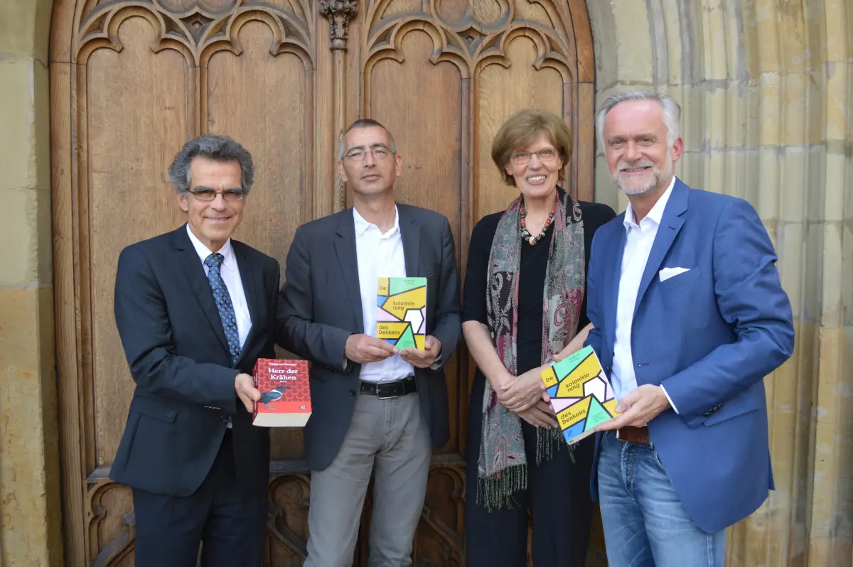 Dr. Sven Jürgensen (Jury-Mitglied), Dr. Thomas Schneider (Leiter Erich-Maria-Remarque-Friedenszetrum), Dr. Anna Stellhove-Fend und Oberbürgermeister Wolgang Griesert verkünden die Preisträger