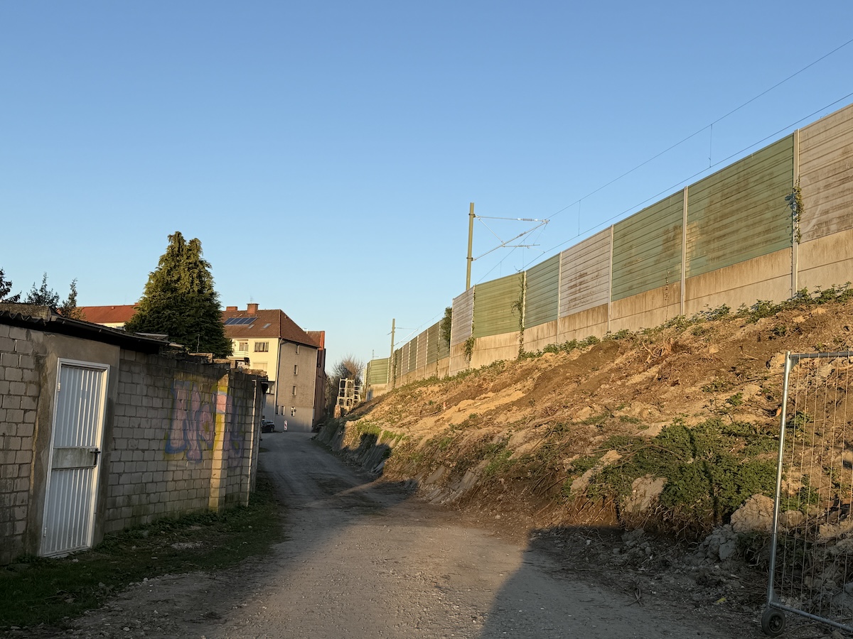 Das Pikante an dieser derzeitigen Baustellenzufahrt: Sie wird nach derzeitigem Stand auch nach der für 2026 geplanten Inbetriebnahme des Bahnhalts der einzige Zugang zu den Gleisen bleiben. Auf dem Weg zu den Zügen wird man dann links den hochaufragenden Bahndamm und rechts ein paar dunkle Garagen- und Hinterhöfe passieren.