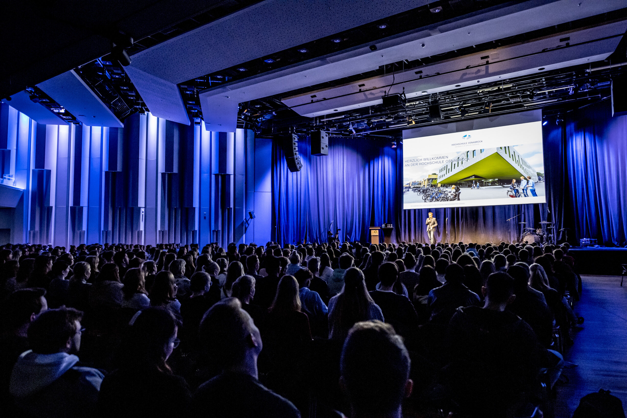 Nach drei Jahren Corona-Pandemie empfing Hochschulpräsident Prof. Dr. Andreas Bertram rund 2.400 Erstsemester erstmals wieder persönlich in der OsnabrückHalle. Am Campus Lingen starten weitere 660 Studienanfänger.