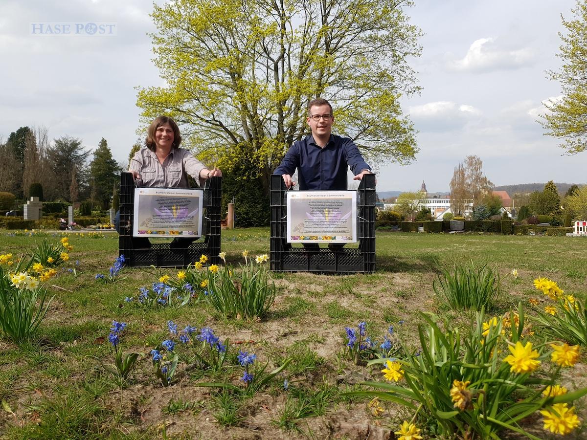 Die Recycling-Zwiebeln blühen wieder auf dem Friedhof in Melle-Mitte. Darüber freuen sich Silke Meier, Vorsitzende des Imkervereins Melle sowie Lennart Frank vom Umweltbüro. / Foto: Stadt Melle