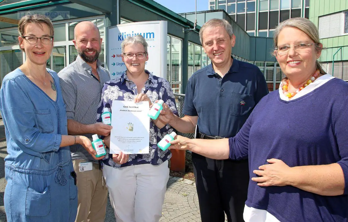 Nachdem sich das Klinikum Osnabrück bereits seit 2017 an einem freiwilligen Überprüfungsprozess beteiligt und dabei aus dem Stand mit Zertifikaten in Bronze und zweimal mit Silber ausgezeichnet wurde, hat es das Qualitätssiegel nun erstmals in „Gold“ erhalten. Niedersachsenweit tragen dieses Siegel aktuell nur 17 Krankenhäuser. Auf den Erfolg ist das fünfköpfige Hygiene-Team des Klinikums sehr stolz, das von Ärztin und Krankenhaushygienikerin Christiane Körbel-Peceny geleitet wird. „Aber nicht wegen der schönen Urkunde“, schmunzelt Körbel-Peceny. „Sondern weil die Händedesinfektion von unseren Mitarbeitenden so vorbildlich umgesetzt wird, dass wir dieses Niveau erreicht haben. Wir können in dem damit verbundenen Prozess genau sehen, welchen Stand es in einzelnen Abteilungen hat, wie die Händehygiene durchgeführt wird und ob oder welchen Verbesserungsbedarf es gibt.“