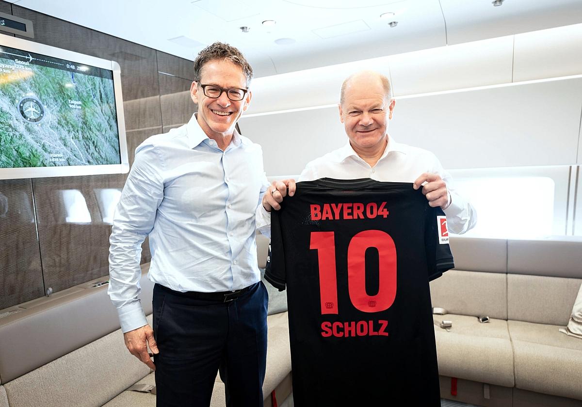 Bundeskanzler Olaf Scholz (SPD) posierte während seiner China-Reise mit einem Trikot des deutschen Fußball-Meisters Bayer Leverkusen. Bayer-Chef Bill Anderson, Mitglied der begleitenden Wirtschaftsdelegation, überreichte dem Kanzler das personalisierte Shirt an Bord des Regierungsflugzeugs.