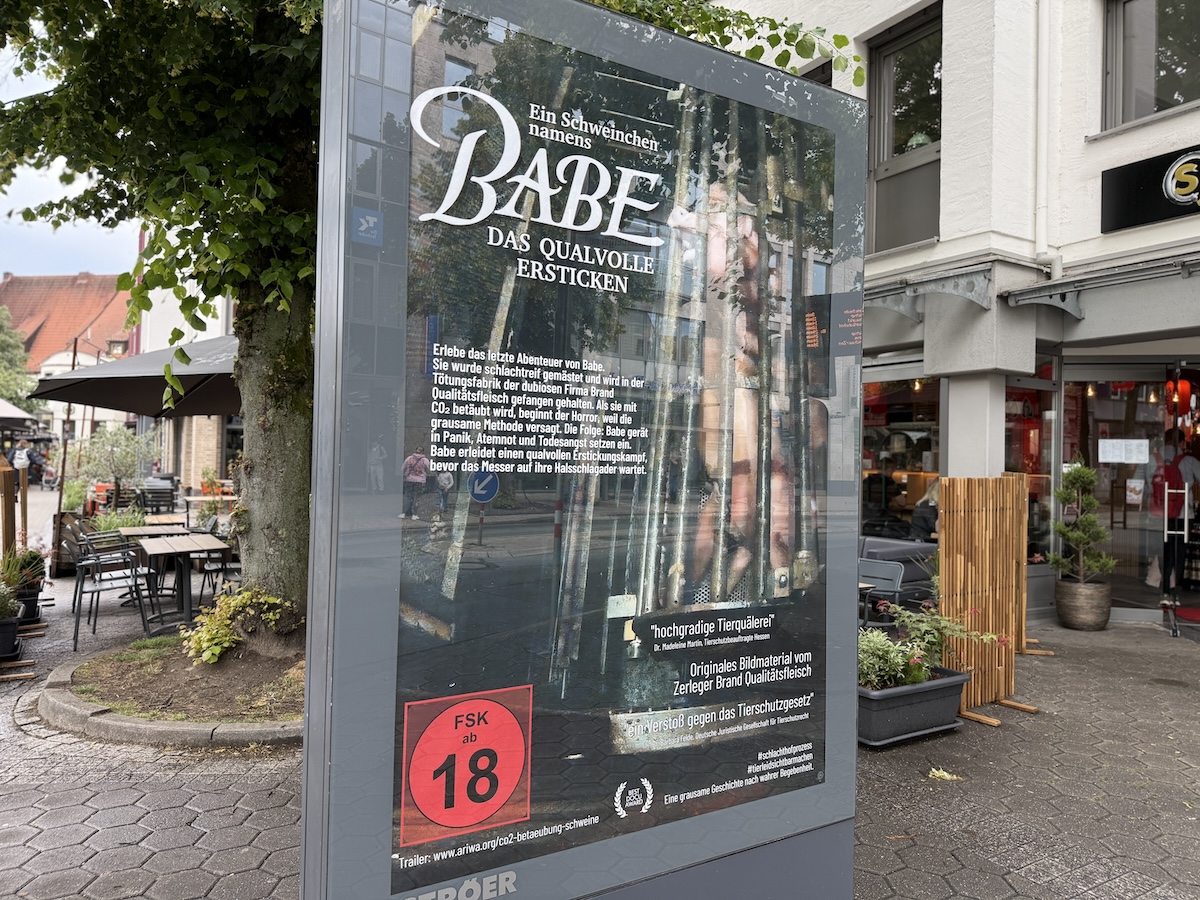 Statt Werbung prangte dort das Motiv eines Kino-Films – mit drastischer Botschaft: Es geht um Tierquälerei bei der CO₂-Betäubung von Schweinen.