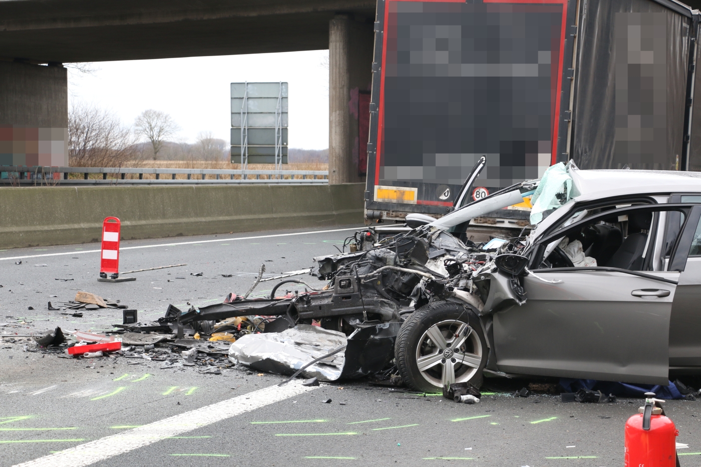 Der Verkehr soll sich zum Unfallzeitpunkt gestaut haben, was der PKW-Fahrer offenbar nicht rechtzeitig bemerkte. Den Spuren zufolge prallte der VW Golf mit hohem Tempo unter den Auflieger eines Sattelzuges. Der Motor des PKW riss heraus und blieb unter dem Auflieger stecken. Die Front des Autos wurde vollständig zerstört und es drehte sich quer zur Fahbahn.