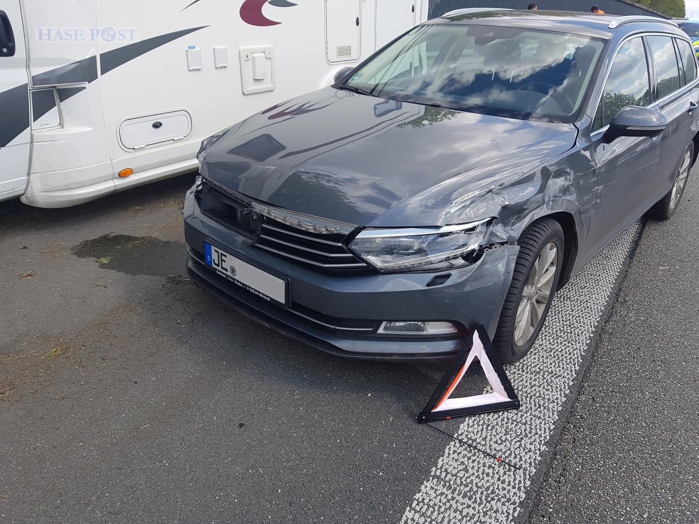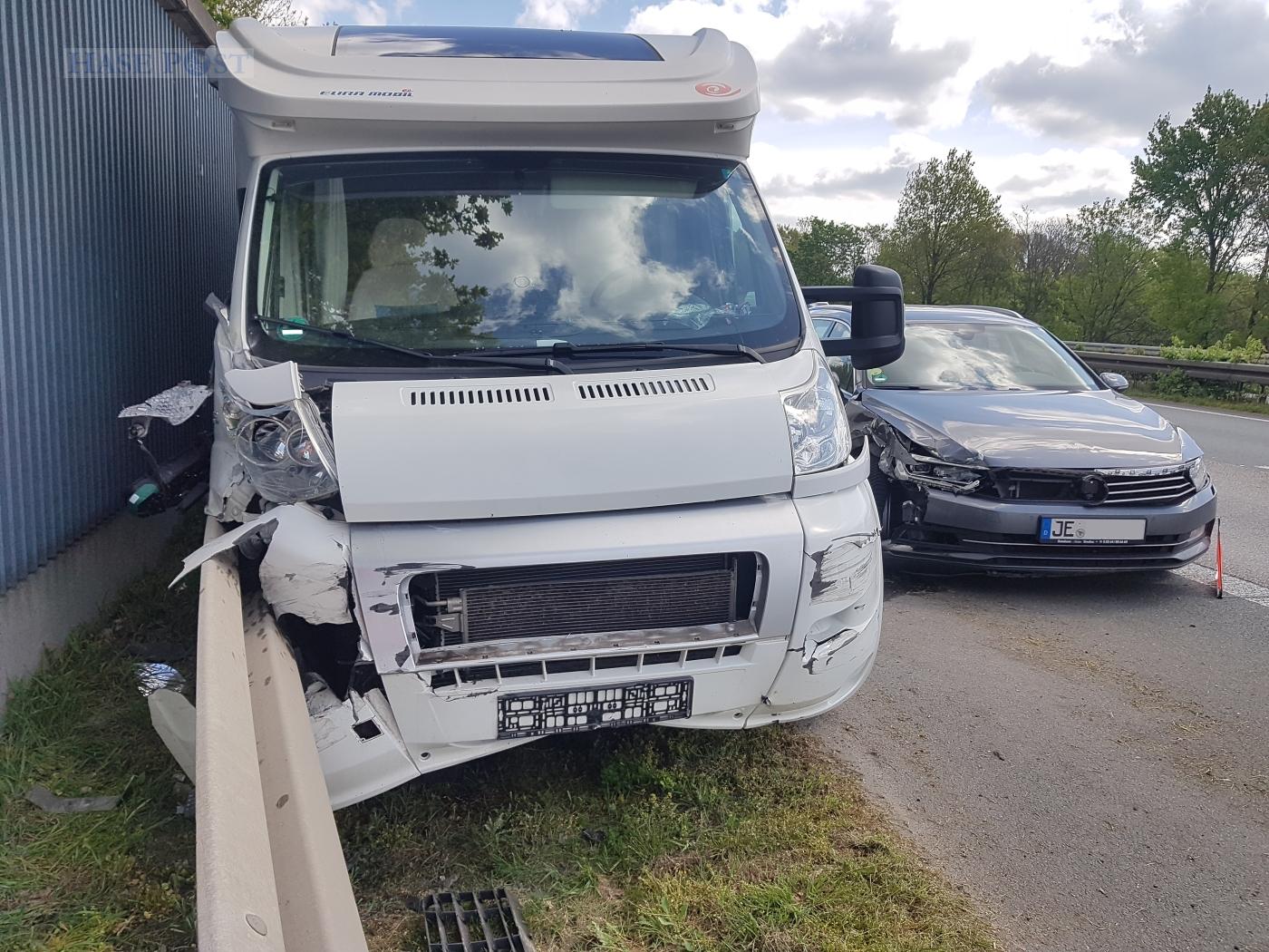 Glücklicherweise wurde niemand verletzt. Am VW Passat, dem Wohnmobil und über mehrere Meter der Leitplanken entstanden massive Sachschäden. Auch an den beiden VW Golf entstanden starke Blechschäden.