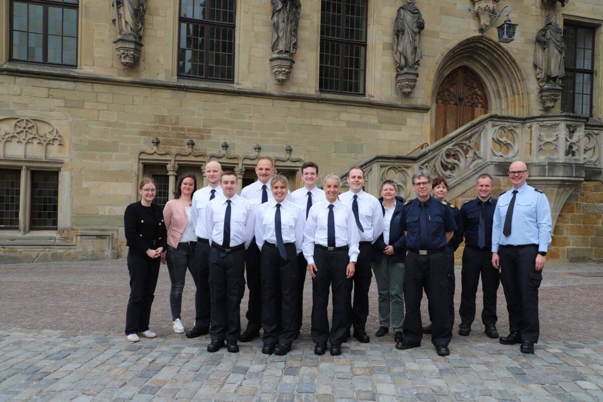 Die Stadt Osnabrück freut sich über eine neue Brandmeister-Anwärterin, fünf neue Brandmeister-Anwärter und eine neue Brandoberinspektor-Anwärterin. Sie alle haben jetzt im Rathaus aus den Händen von Heike Pape, als Sozialvorstand unter anderem für die Feuerwehr zuständig, und Dietrich Bettenbrock, Leiter der Berufsfeuerwehr, ihre Ernennungsurkunden überreicht bekommen. Alle sieben sind nun Beamte auf Widerruf und starten in ihre zweijährige Ausbildung.