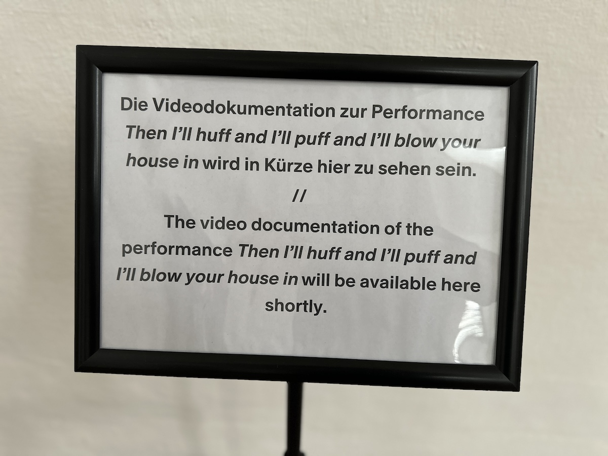 Ein etwas versteckt im Eingangsbereich zur Dominikanerkirche stehendes Schild weist darauf hin: „Die Videodokumentation zur Performance […] wird in Kürze hier zu sehen sein“ – knapp eine Woche nach der Performance.
