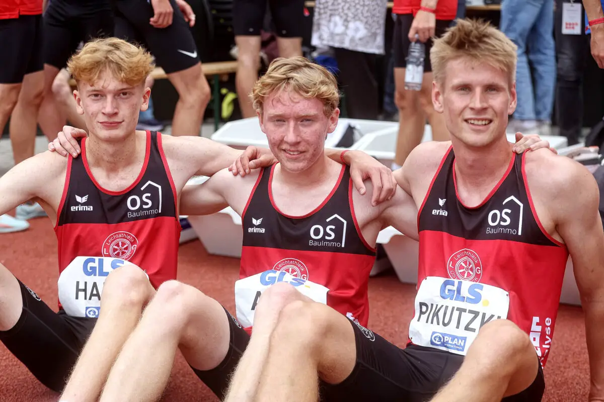 Einen herben Dämpfer musste die U20-Staffel über 4×400 Meter hinnehmen: Platz 17 am Samstag. Doch das Team mit Niclas Brinkmann, Konstantin Hans, Matthias Apel und Mika Pikutzki zeigte am Sonntag über 3×1000 Meter eindrucksvolle Leistungen. Startläufer Hans brachte die Osnabrücker gegen teils vier Jahre ältere Konkurrenz in Führung, Apel baute diese aus – und Schlussläufer Pikutzki genoss den Applaus der 10.000 Zuschauer im erstmals eingeführten Fanblock eines deutschen Podcasts. Mit 7:44,88 Minuten lag das Team vorerst vorn. Nach dem zweiten Zeitlauf stand fest: Platz sechs – so gut war eine Osnabrücker Staffel noch nie bei Deutschen Meisterschaften platziert.