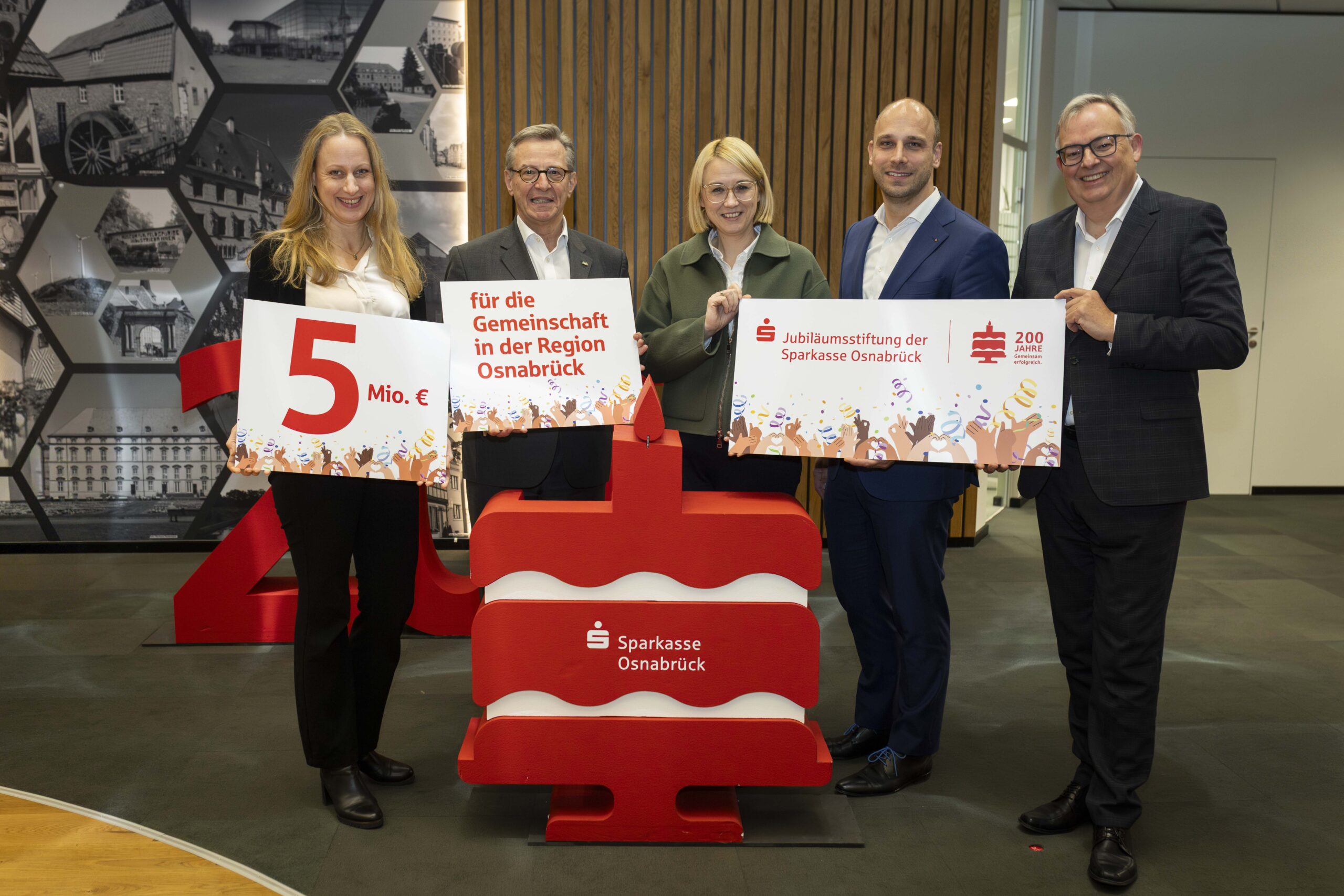 Bildunterschrift zum Titelbild: Freuen sich über die Investition von 5 Millionen Euro für die Förderung von Gemeinschaft & Integration im Geschäftsgebiet der Sparkasse Osnabrück (v.l.n.r.): Landrätin Anna Kebschull, Vorstandsvorsitzender Johannes Hartig, Oberbürgermeisterin Katharina Pötter, Vorstandsmitglied Fabian Winkler sowie André Schüller, stellvertretender Vorstandsvorsitzender. Foto: S. Hehmann.