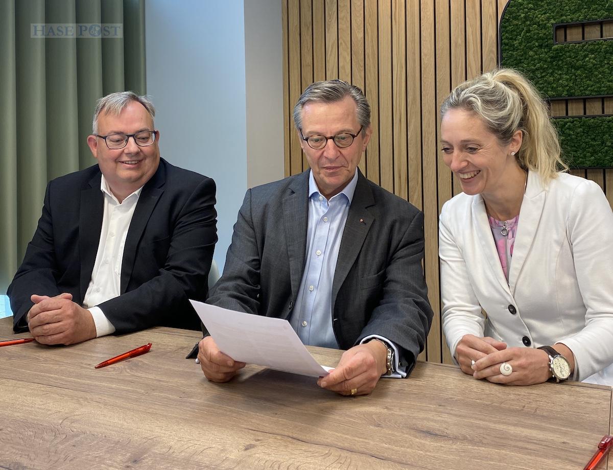 (von links) André Schüller (Firmenkunden-Vorstand), Johannes Hartig (Vorstandsvorsitzender) und Nancy Plaßmann (Privatkunden-Vorständin) unterzeichnen die Selbstverpflichtung. / Foto: Dörthe Janning