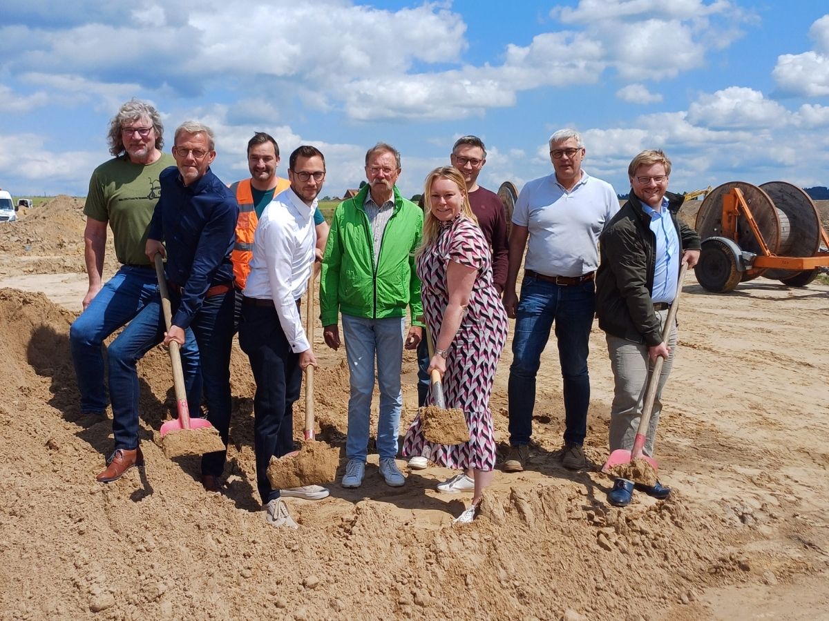 Beim symbolischen ersten Spatenstich haben Melles Bürgermeisterin Jutta Dettmann, Ortsbürgermeister Wilhelm Hunting, Stadtbaurat Florian Schmeing, der Geschäftsführer der Wohnungsbau Grönegau GmbH, Philipp Wilken, sein Kollege Dennis Luckas, Gerd Wien vom städtischen Tiefbauamt, Michael Kipsieker als Vertreter des Planungsbüros HI-Nord, Sven Schnittger von der Dallmann Straßen- und Tiefbau GmbH & Co. KG und der Leiter der Immobilienvermittlung der Kreissparkasse Melle, Rainer Kellermann, am 4. Juni die Erschließung des Baugebietes „An der Blanken Mühle II“ in Buer gewürdigt.