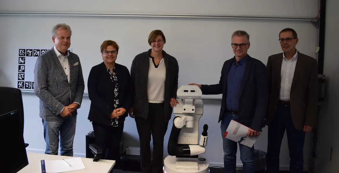 v.l.n.r.: Professor Wolfgang Lücke (Präsident der Universität Osnabrück), Dr. Silke Lesemann (hochschulpolitische Sprecherin der SPD-Landtagsfraktion), Dr. Thela Wernstedt (Frauen- und Gleichstellungspolitische Sprecherin der SPD-Landtagsfraktion), TIAGO (Roboter), Frank Henning (Landtagsabgeordneter), Professor Joachim Hertzberg (Leiter des „Forschungsbereichs planbasierte Robotersteuerung“).