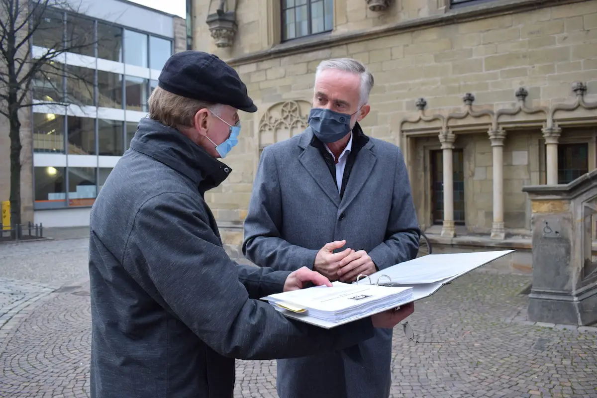 Thomas Polewsky (Vertreter der Stadtbahninitiative) und Wolfgang Griesert (Oberbürgermeister Osnabrücks) bei der Übergabe der Petition. / Foto: Rykov.
