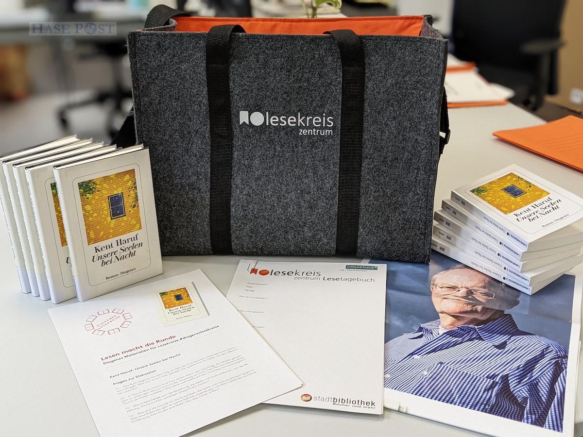 Mit einer Tasche ist ein kompletter Lesekreis mit Lesestoff versorgt: Zehn Exemplare von einem Titel warten darauf, im Lesekreis verteilt, gelesen und besprochen zu werden. Außerdem ist Zusatzmaterial wie Autoren-Interviews oder Anregungen für Diskussionsfragen enthalten. Die Lesekreis-Taschen sind Teil des Projektes „Lesekreis-Zentrum“ der Stadtbibliothek Osnabrück.