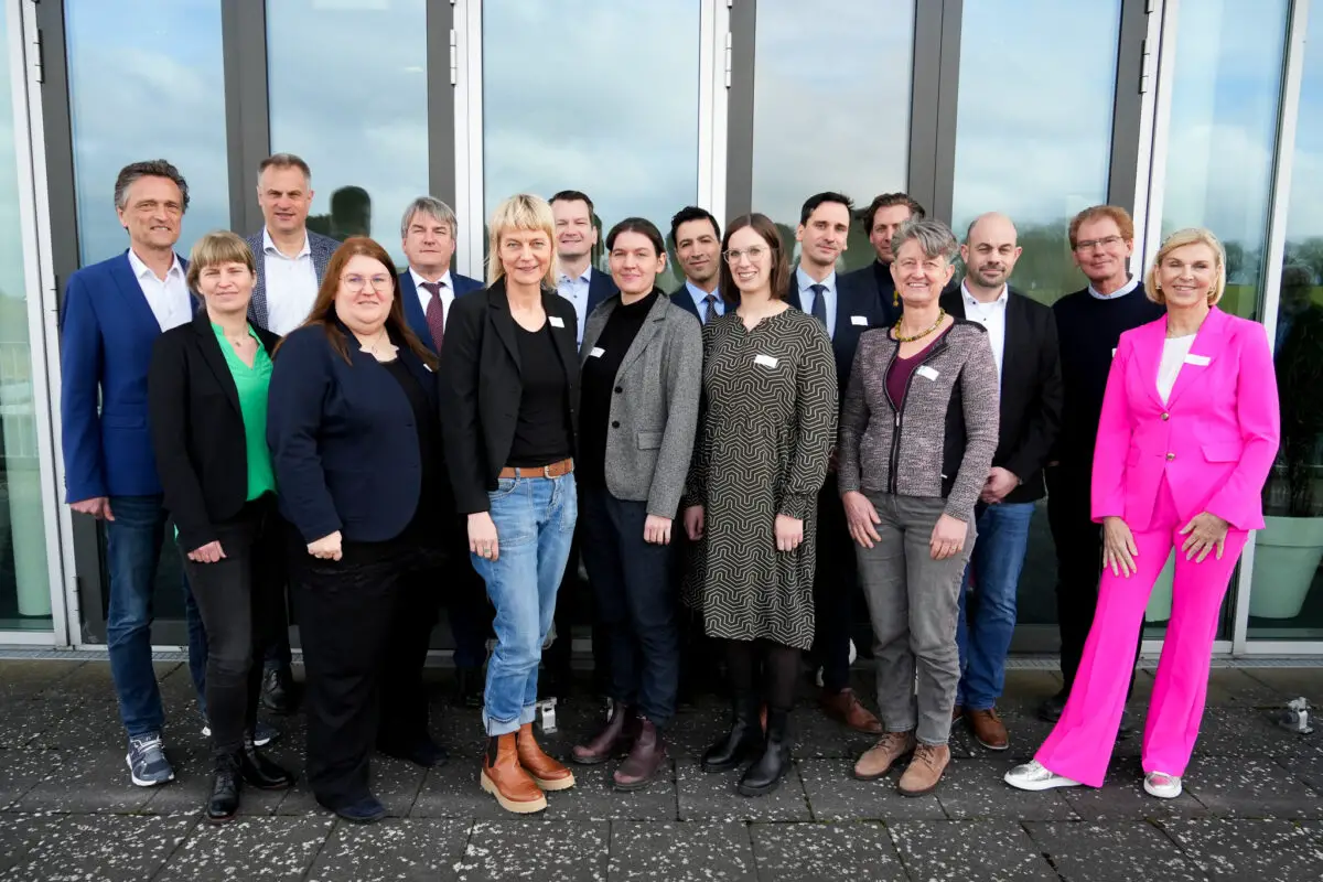 Bildunterschrift: Hochschulpräsident Prof. Dr. Andreas Bertram, Prof. Dr. Alexander Schmehmann (beide links), Vizepräsident für Studium und Lehre und Prof. Dr. Andrea Braun von Reinersdorff, Vizepräsidentin für Internationales (rechts) begrüßen die neuen Professor*innen und Verwalter*innen einer Professur. In alphabetischer Reihenfolge: Dr. Jan Berstermann, Dr. Clemens Flock, Dr.-Ing. Marie Hanusch, Dr.-Ing. Katrin Jahns, Dr. Ralf Ferdinand Joest, Prof. Dr. Thomas Ley, Dr. Javad Mola, Dr. Caroline Niehoff, Dr. Eva Renvert, Dr.-Ing. Peter Sachnik, Dr.-Ing. Cathrin Schröder, Dr. Lisa Maria von Glahn, Dr.-Ing. Benjamin Weinert. Foto: Hochschule Osnabrück
