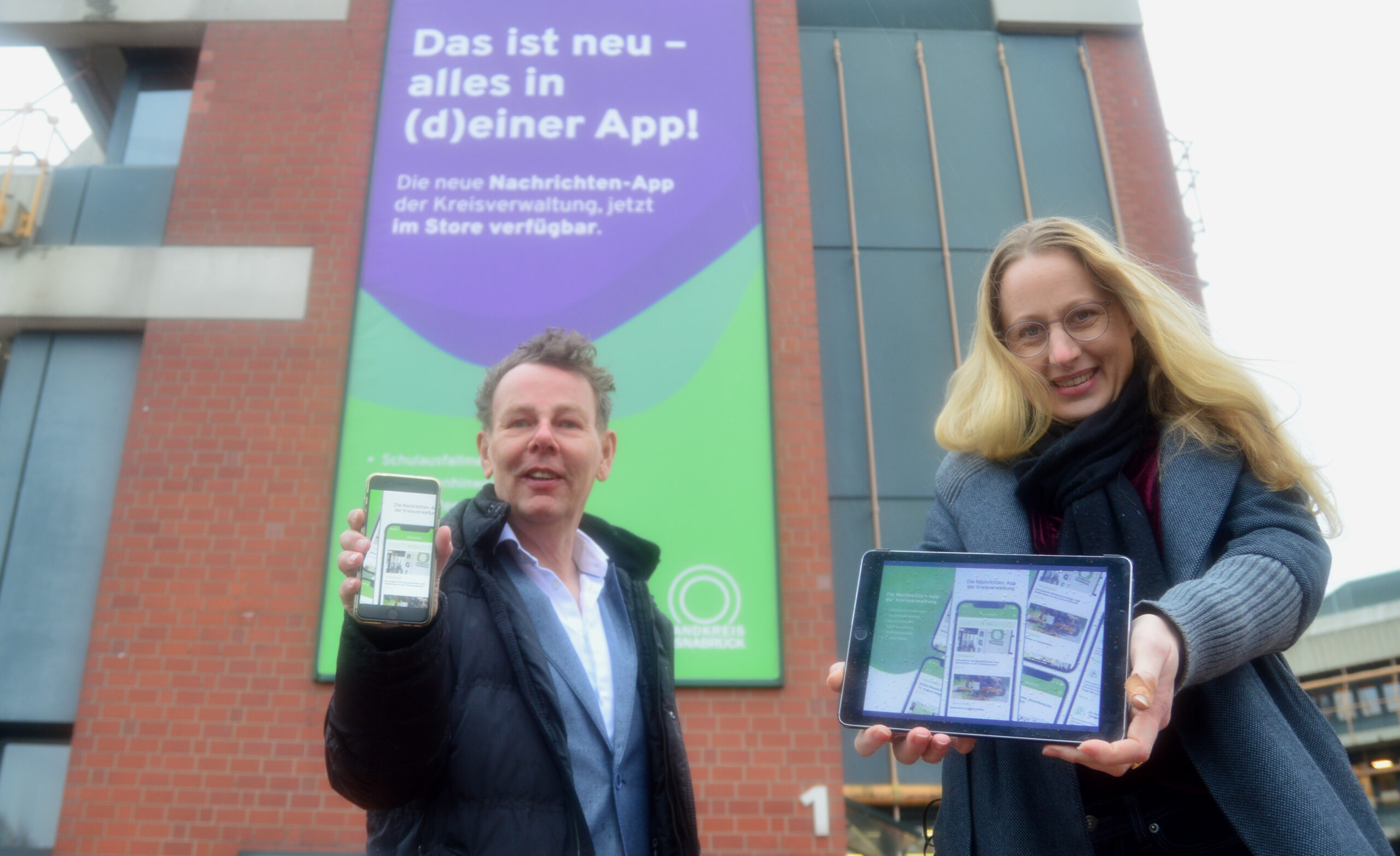 Landrätin Anna Kebschull und Kai Brauer (Online-Redaktion) präsentieren die neue Nachrichten-App der Kreisverwaltung. Sie steht ab sofort in den Stores von Apple und Google zum Download bereit. /Foto: Landkreis Osnabrück (Henning Müller-Detert)