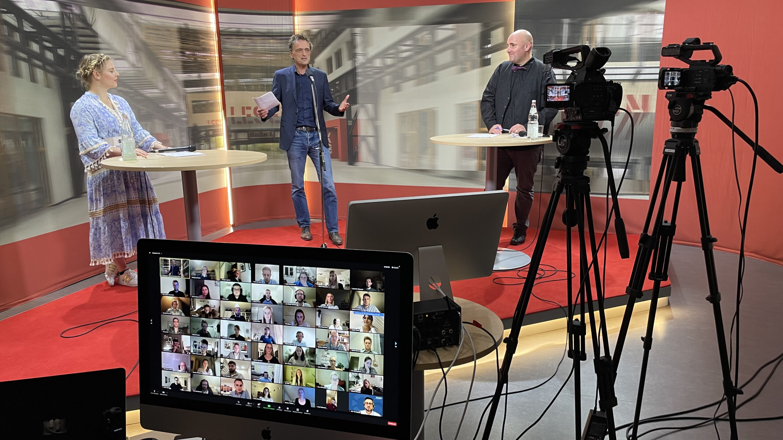 Aus dem hochschuleigenen Fernsehstudio begrüßte Hochschulpräsident Prof. Dr. Andreas Bertram (Mitte) die Teilnehmenden. Judith Bange und Benjamin Häring vom Institut für Theaterpädagogik führten durch den Abend. /Foto: Hochschule Osnabrück