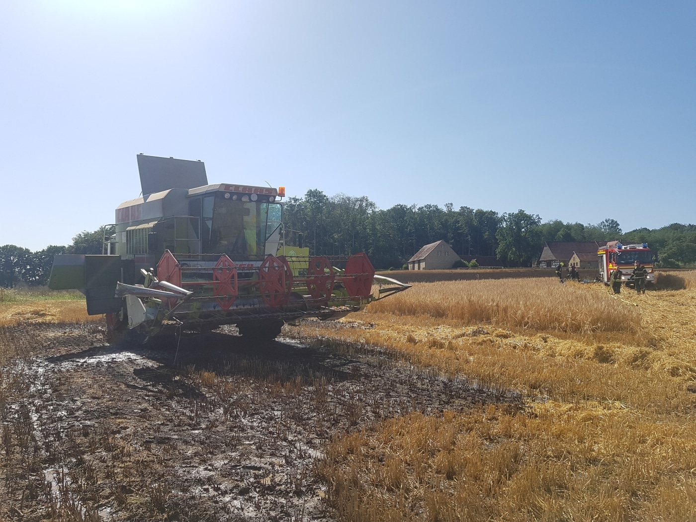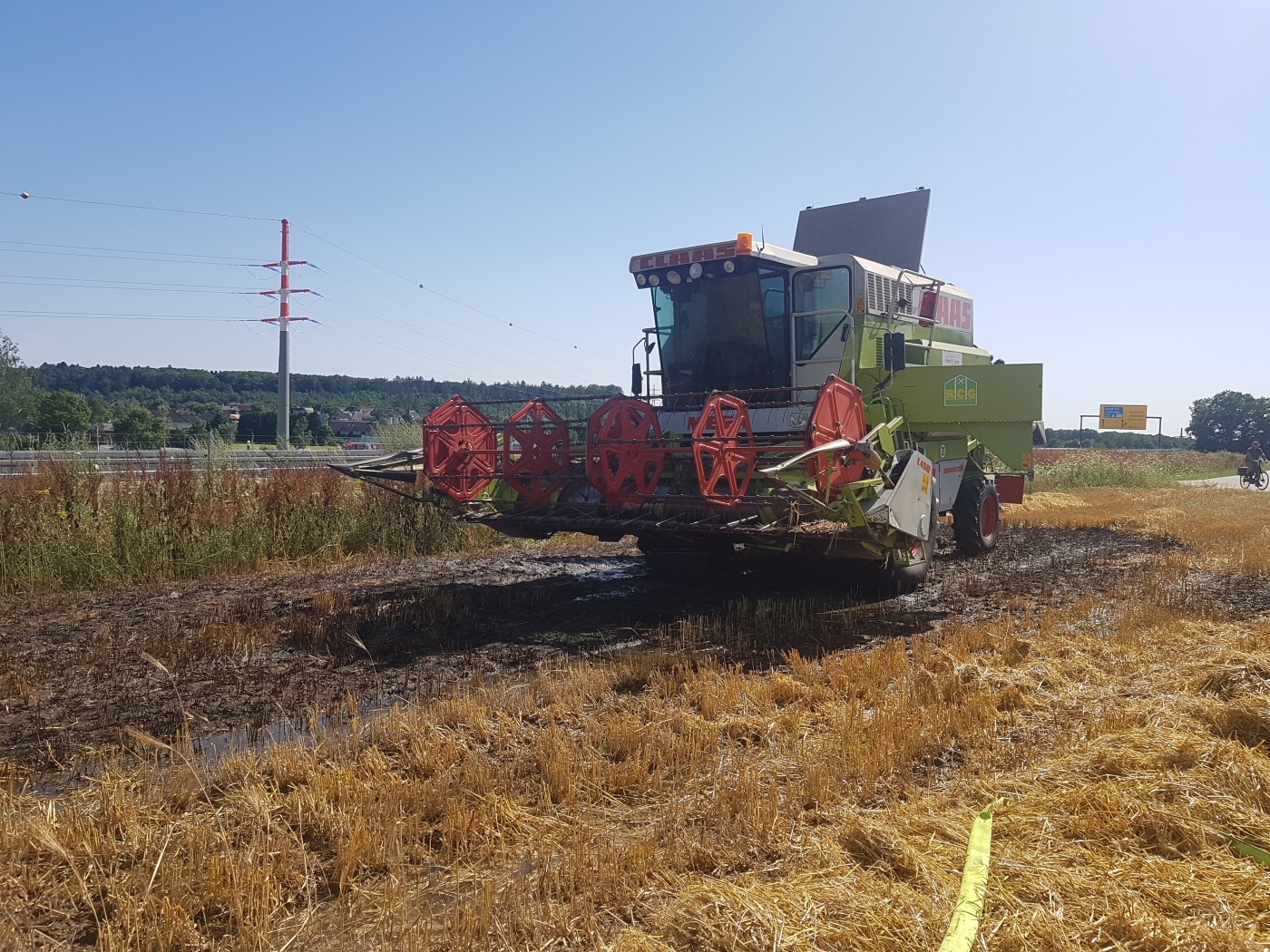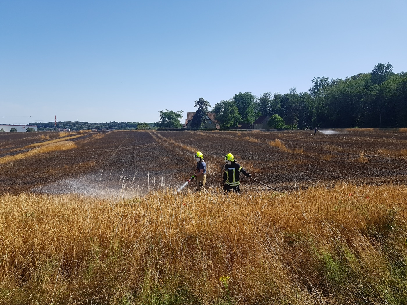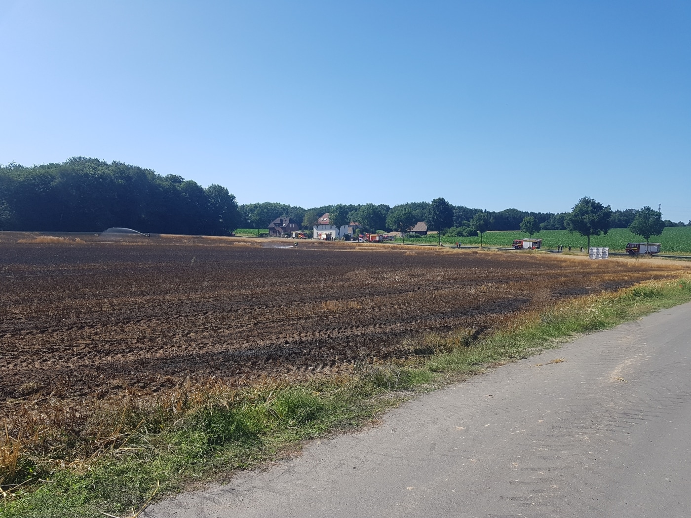 Parallel zur Brandbekämpfung am Feld brach ein weiteres Feuer aus. Der zuvor für die Mäharbeiten genutzte Mähdrescher war anfangs auf einem benachbarten Feld in Sicherheit gebracht worden. Auch er begann aber zu brennen. Durch ein schnelles Eingreifen, konnte hier ein weiteres größeres Feuer verhindert werden. Das Gerät ist zwar nicht mehr einsatzbereit, aber nach erstem Anblick kein Totalschaden, schätzte der Fahrer.
