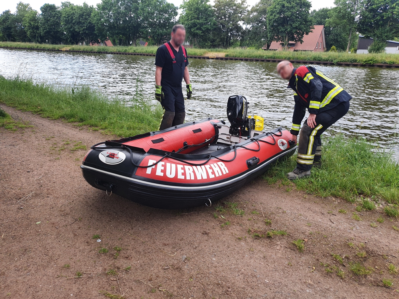 Passanten hatten es gegen 13:45 Uhr bemerkt. Die Feuerwehr kam kurz darauf mit einem Boot zur Hilfe. Ein paar der ehrenamtlichen Retter bereiteten das Schlautboot für den Einsatz vor. Währenddessen gelang es anderen schon, das Tier aus dem Wasser zu hieven, weil es sich nah an der Spundwand befand.