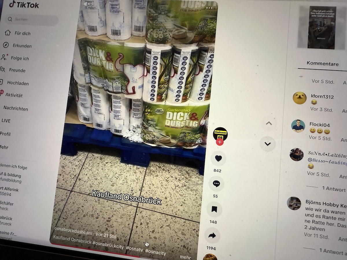 Gibt es ein Ratten-Problem im Kaufland Osnabrück? Ein TikTok-Video, das am Mittwoch viral ging und bis zum Abend bereits mehr als 65.000-mal abgerufen wurde, zeigt eine Großpackung Küchenrollen, die offenbar von Nagetieren zum Nestbau angeknabbert wurde.