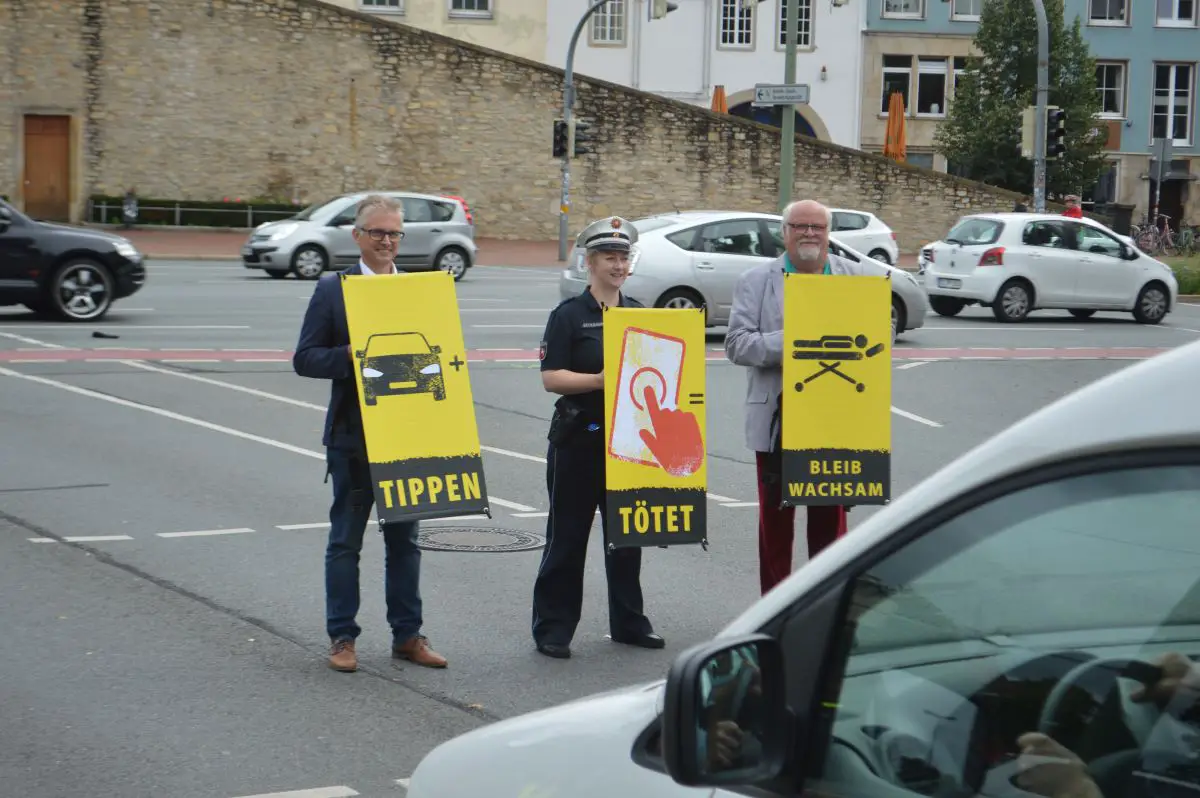Die Verkehrssicherheitskampagne „Tippen tötet“ geht mit neuen Motiven in ganz Niedersachsen in die nächste Runde. Nun stehen neben Autofahrern auch Radfahrer und Fußgänger, die im Straßenverkehr das Handy benutzen, im Fokus. Osnabrück ist der vierte Halt einer Sieben-Städte-Tour, bei der auf das Thema aufmerksam gemacht werden soll.