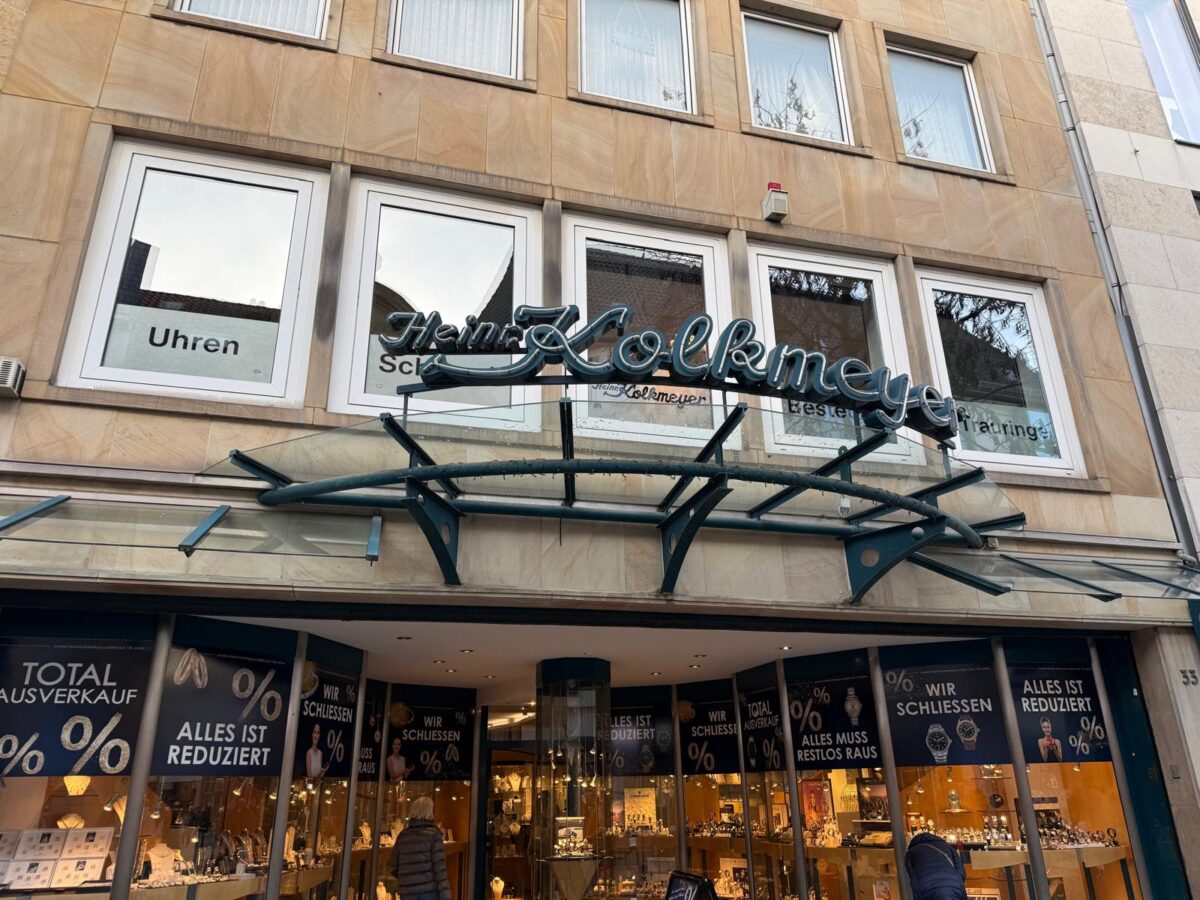 Seit 1896 gehört „Heinr. Kolkmeyer zur Trauringecke“ fest zum Osnabrücker Stadtbild. Gegründet vom Uhrmachermeister Heinrich Kolkmeyer, war das Geschäft in der Großen Straße über Generationen eine Institution für edle Uhren, feinen Schmuck und handwerkliche Präzision. Nun endet diese Ära – nach fast 130 Jahren schließt das Traditionshaus seine Türen.