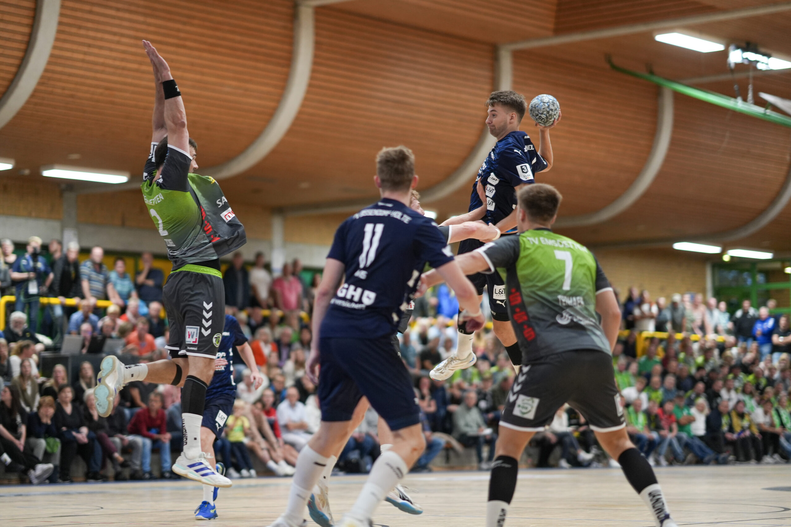 Die Begegnung begann wie erwartet mit hohem Tempo auf beiden Seiten. Doch besonders in der Anfangsphase überzeugte der TVB-H mit schönen Kombinationen in der Offensive, sodass es nach acht Minuten 5:4 stand. Trotz einiger Ballgewinne in der Defensive durch Paraden und technische Fehler der Emsdettener, gelang es nicht den Rückstand zu drehen. Der ehemalige Emsdettener Lukas Tamms war es, der in der 14. Minute auf 10:9 verkürzte. Bis zum 14:13 in der 19. Spielminute war es ein Spiel auf Augenhöhe, ehe sich die Hausherren immer weiter absetzen konnten. Die zahlreiche Erst- und Zweitligaerfahrung im Kader der Hausherren machte sich bemerkbar. Über 20:16 zog der TVE bis zur Halbzeitpause auf 24:19 davon.