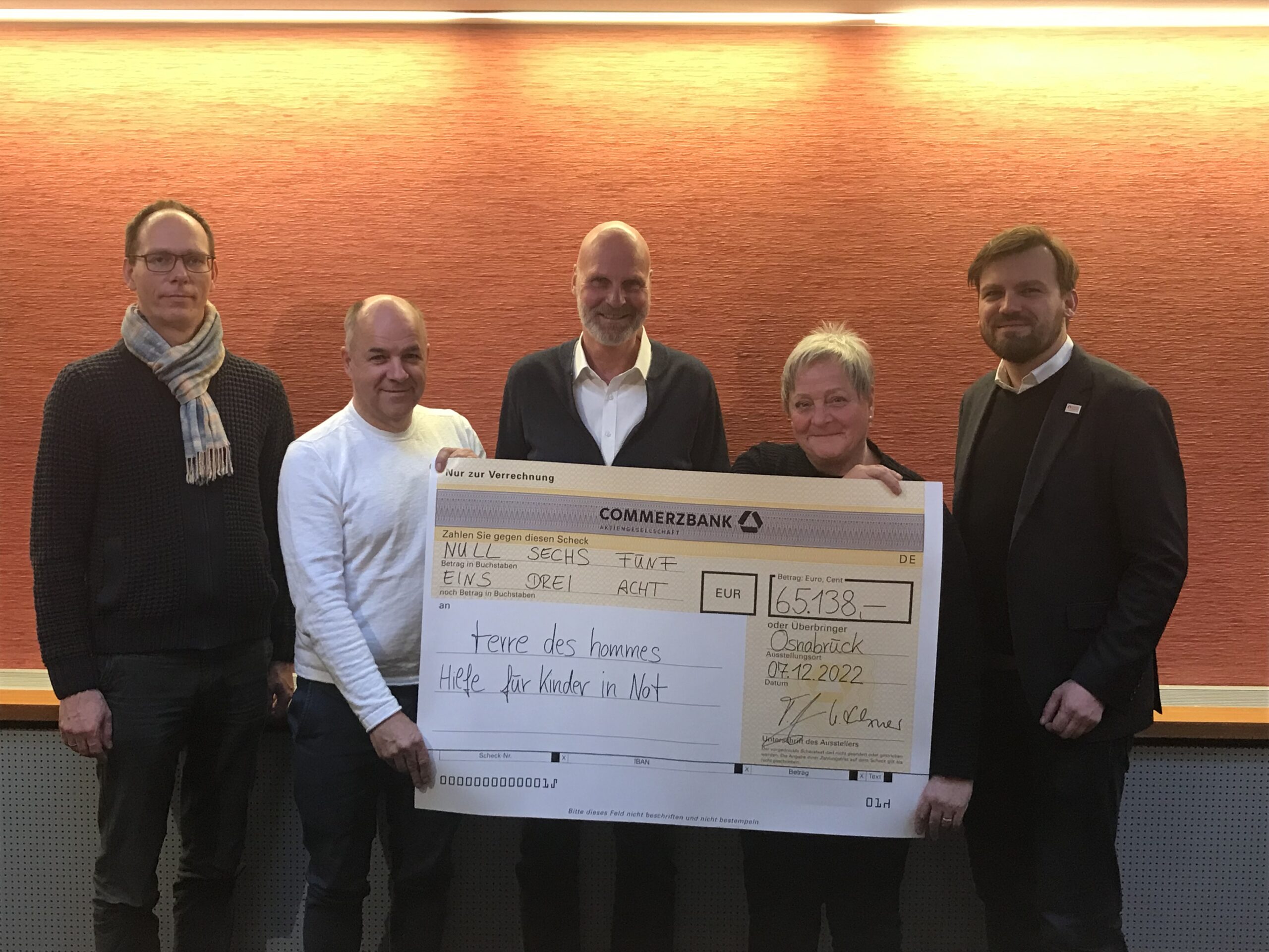 (von links) Jan-Hinnerk Voss (Asien Referent terres des hommes), Bert Mutsaers (Inhaber Bedford), Thorsten Schäfer (Geschäftsführer Bedford), Gabi Mutsaers (Inhaberin Bedford) und Hendrik Addens (Referent Unternehmen und Stiftungen terres des homme) bei der Scheckübergabe. / Foto: Burrichter