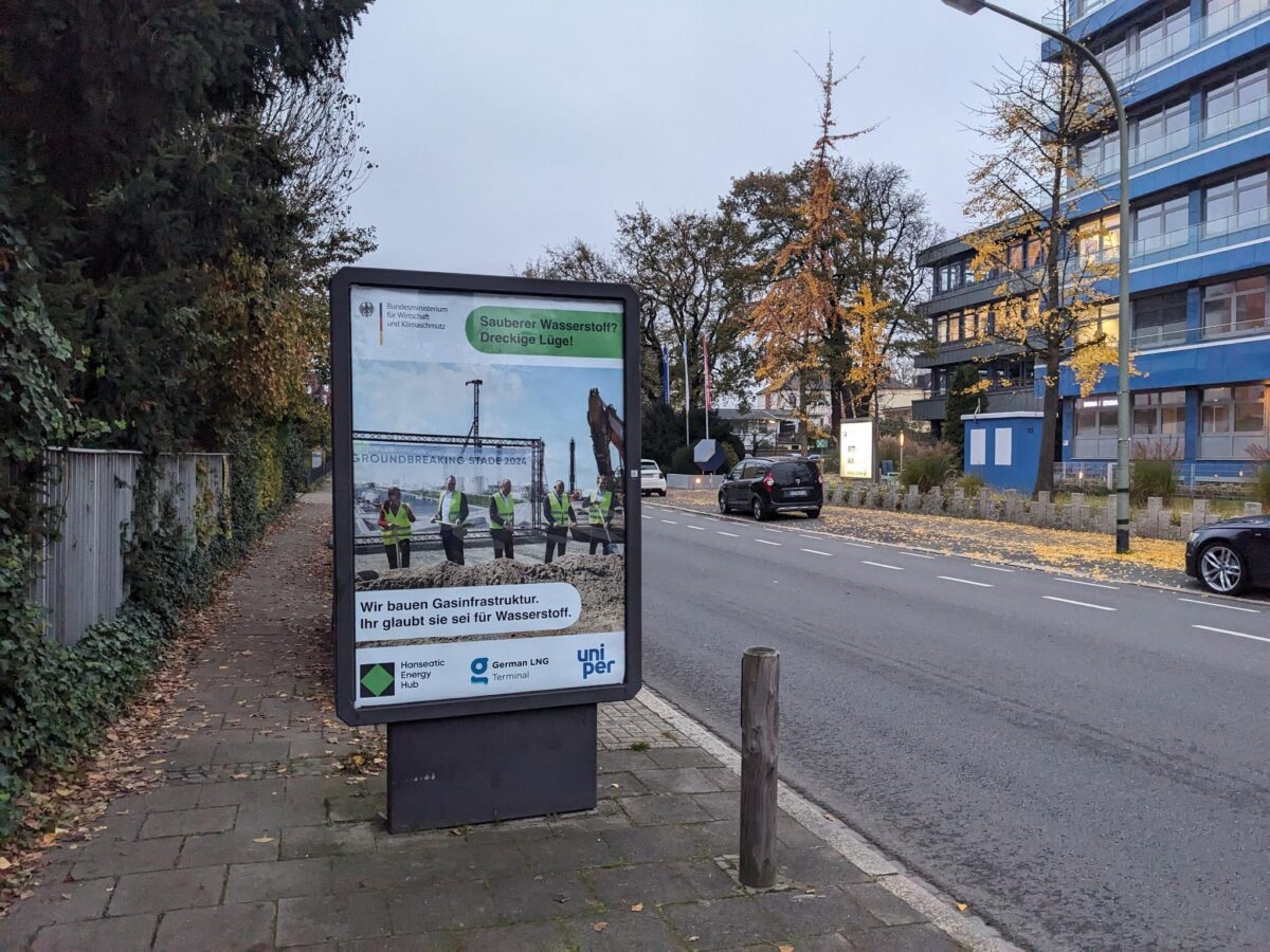 Mit einer Protestaktion haben Aktivisten der Gruppen „Extinction Rebellion“ und „Ende Gelände“ am 14. November auf die problematische Entwicklung der LNG-Infrastruktur in Deutschland aufmerksam gemacht. An 15 Werbetafeln in Osnabrück prangten Botschaften wie „Sauberer Wasserstoff? Dreckige Lüge!“. Die so genannte Adbusting-Aktion kritisiert den Ausbau fossiler LNG-Terminals und die damit verbundenen Umweltauswirkungen.