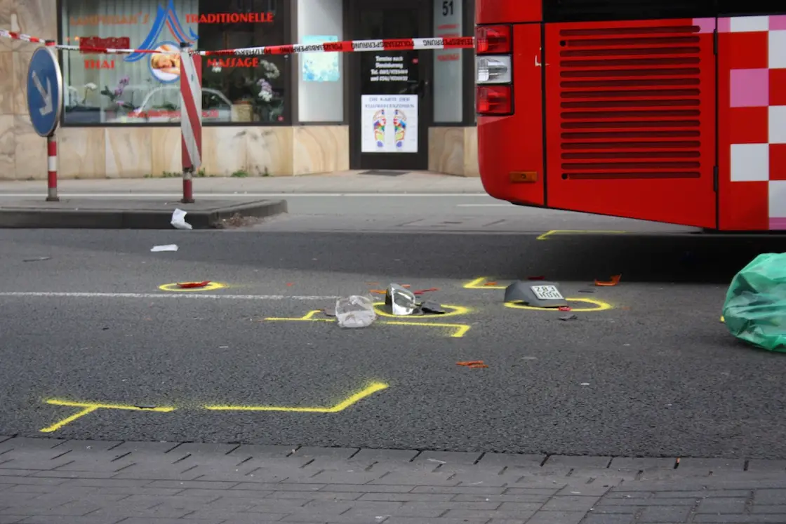 Gegen 12:15 Uhr hielt ein Bus im Bereich der zweispurigen Fahrbahn auf dem rechten Fahrstreifen an der Bushaltestelle vor einem Lebensmittelmarkt. Hinter ihm folgten ein Rollerfahrer und ein PKW. Nach ersten Ermittlungen der Polizei, versuchte der Rollerfahrer dann knapp hinter dem Bus auf den linken Fahrstreifen zu wechseln. Dort kollidierte er frontal mit einem weiteren Bus auf Höhe dessen Vorderachse. Durch den Zusammenstoß wurde der Rollerfahrer zurück nach rechts geschleudert und stieß mit dem hinter ihm fahrenden PKW zusammen, bevor er wieder nach links noch einmal gegen den Bus geriet.