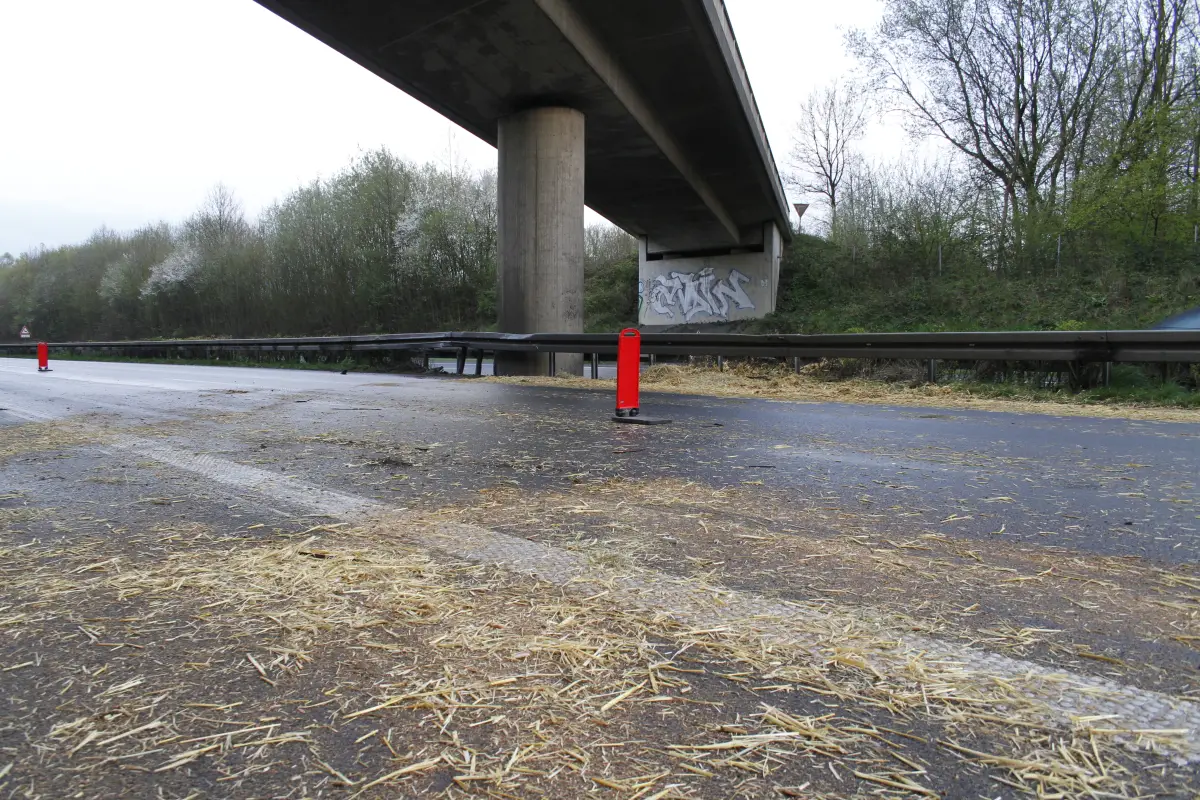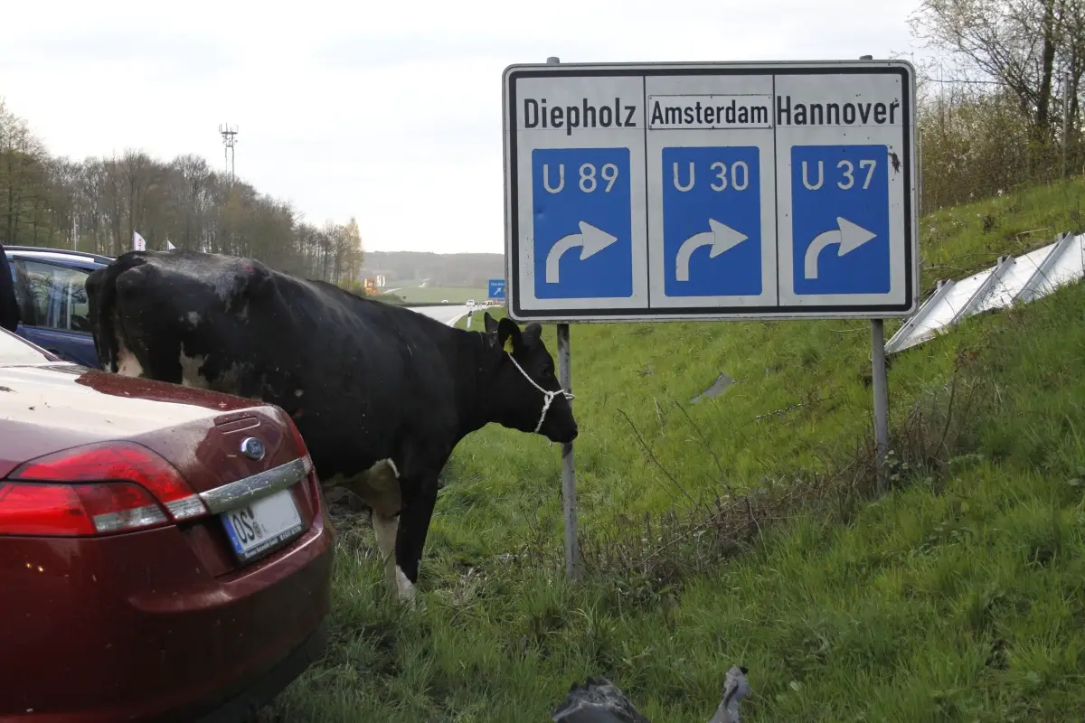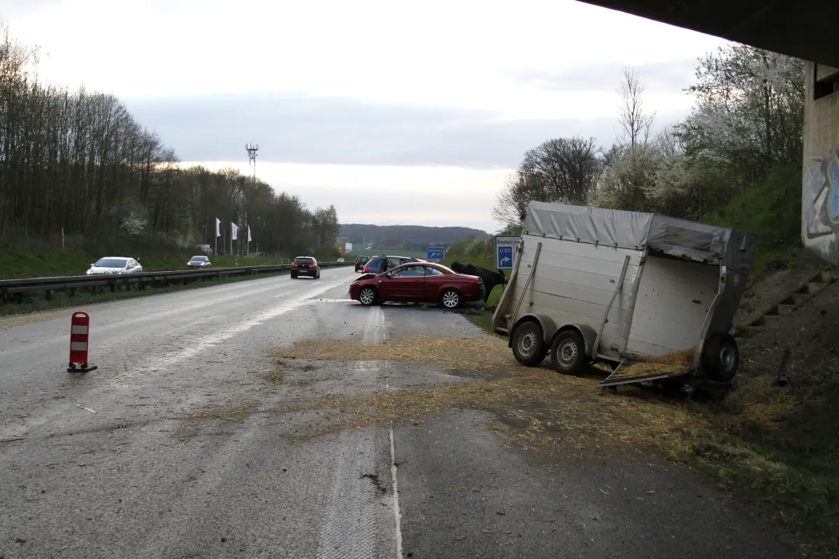 Im Tieranhänger befand sich eine Kuh, die darin angebunden war. Durch den Zusammenstoß wurde sie losgerissen und lief kurz darauf auf der Fahrbahn umher. Ihr Besitzer, zeitgleich Fahrer des Zugfahrzeuges, konnte sie schnell auf den Seitenstreifen führen und band sie vorsorglich an einem Verkehrsschild an.