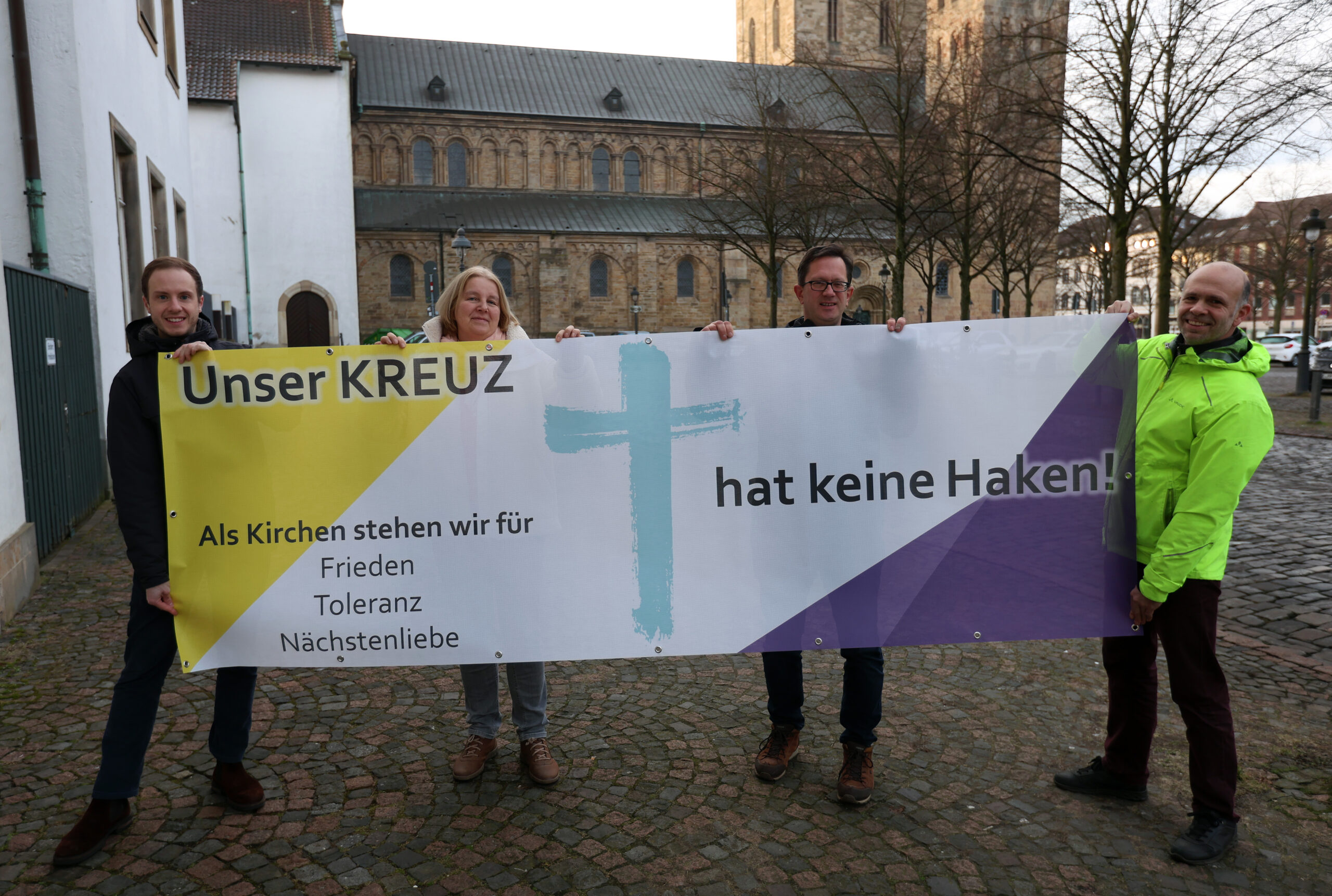Knapp 40 evangelische und katholische Kirchengemeinden, Verbände und die Caritas in Osnabrück und Umgebung beteiligen sich mit mehr als 70 Bannern an der Aktion „Unser Kreuz hat keine Haken“. Ab Montag, 27. Januar – dem Gedenktag für die Opfer des Nationalsozialismus – werden an Kirchen, Gemeindehäusern und anderen kirchlichen Gebäuden Banner mit dieser Aufschrift hängen. Organisiert wurde die Aktion unter anderem von der katholischen Domgemeinde St. Petrus in Osnabrück.
