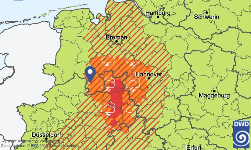 Von Süden ziehen örtlich kräftige Gewitter auf. Begleitet werden sie laut DWD Unwetterwarnung für Osnabrück von Sturmböen mit Geschwindigkeiten bis zu 75 km/h (Bft 9), Starkregen zwischen 15 und 25 Litern pro Quadratmeter pro Stunde sowie Hagelschlag.