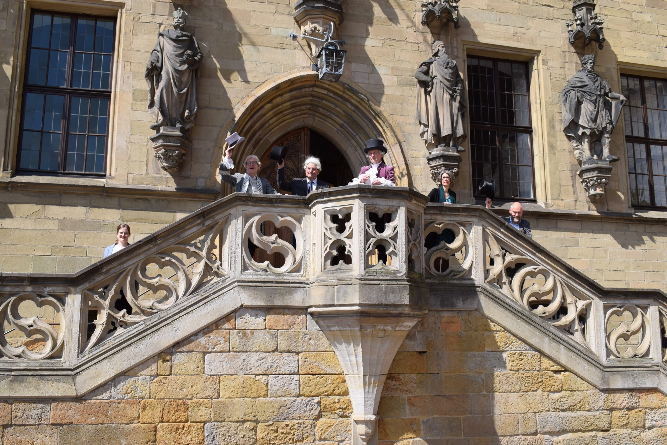 Freuen sich auf zwei Jahre mit Justus Möser: Leonie Albes (Projekt Veranstaltungsnetzwerk Justus Möser), erster Stadtrat Wolfgang Beckermann (stellv. Vorsitzender des Landschaftsverbands), Kreisrat Matthias Selle (Vorsitzender Landesverband), Justus Möser (Publizist und Aufklärer), Dr. Susanne Tauss (Geschäftsführerin Landesverband) und Dr. Hermann Queckenstedt (Vorstandsmitglied Landschaftsverband).