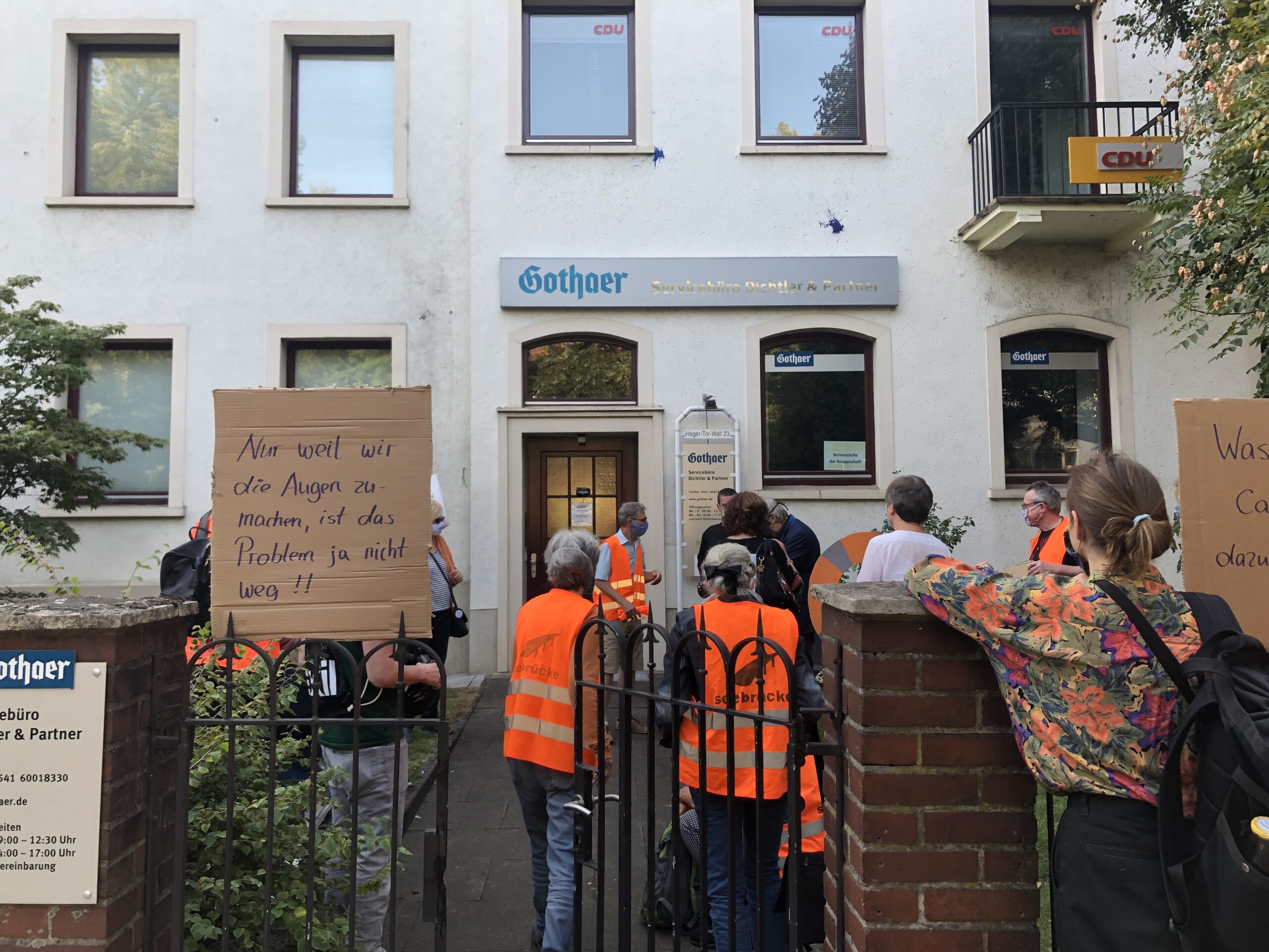 „Wir führen aktuell mit Dr. Mathias Middelberg ein Gespräch zur Situation auf Lesbos“, erklärt Renate Heise (Seebrücke Osnabrück) am Dienstagnachmittag vor der CDU-Geschäftsstelle am Heger Tor Wall, „wir müssen die Menschen hierherholen und nicht bei eintausend Personen eine Grenze ziehen.“ Ungefähr 35 Unterstützende haben sich vor dem Gebäude versammelt, in dem Dr. Gerrit Schulte und Tim Zumloh Dr. Mathias Middelberg im Rahmen der Bürgersprechstunde einen Offenen Brief zur aktuellen Situation der Geflüchteten auf der griechischen Insel Lesbos übergaben – auch Vertreterinnen der Organisation „Oma gegen Rechts“ waren vor Ort.