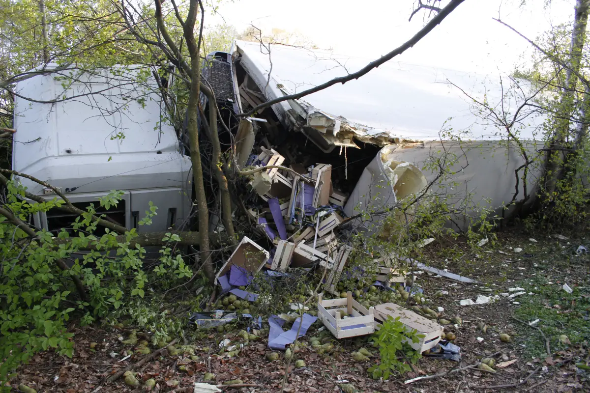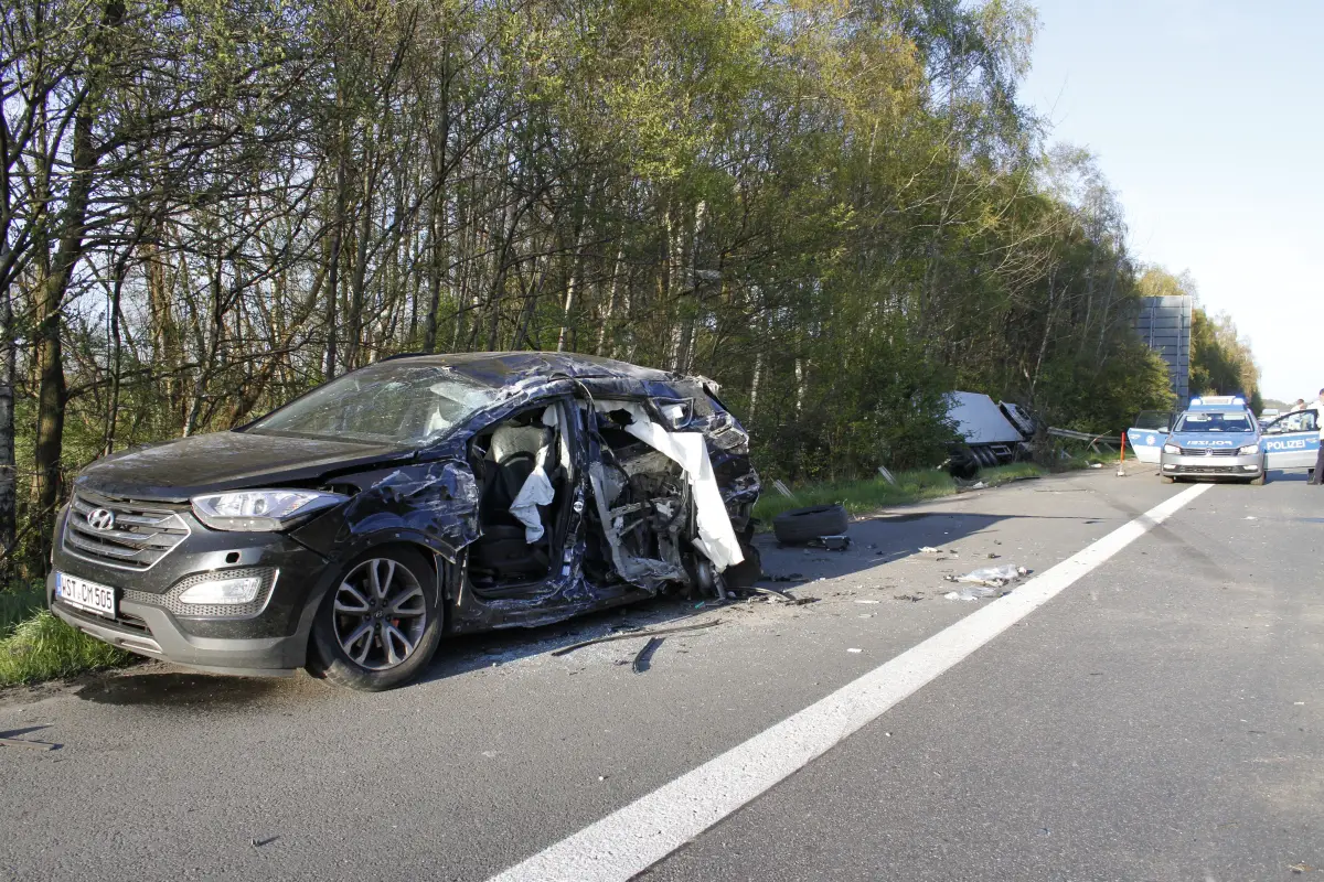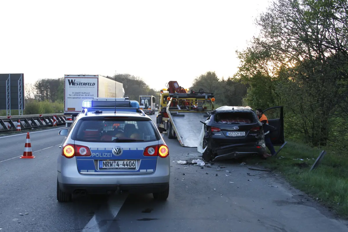 Gegen 18 Uhr kam ein Sattelzug zwischen dem Autobahnkreuz Lotte/Osnabrück und der Anschlussstelle Hasbergen/Gaste in Fahrtrichtung Bad Oeynhausen von seiner Fahrbahn ab. Im Bereich einer Autobahnbrücker durchbrach er die mittlere Leitplanke, krachte seitlich in einen PKW in Fahrtrichtung Rheine und durchbrach die Außenleitplanke der Gegenfahrbahn, wonach er zwischen Bäumen im angrenzenden Wald zum Stehen bzw. Liegen kam.