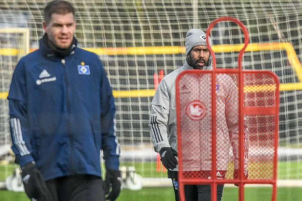 Titelfoto: Simon Terodde mit Trainer Daniel Thioune, Trainingsgelände Volksparkstadion; imago images / Oliver Ruhnke