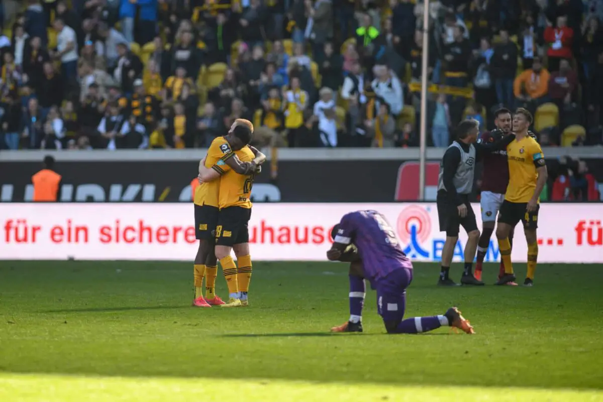 Dynamo feiert den Heimsieg, im Bild: Michael Akoto (links) und Paul Will (rechts), davon Maxwell Gyamfi (VfL Osnabrück). / IMAGO / Dennis Hetzschold