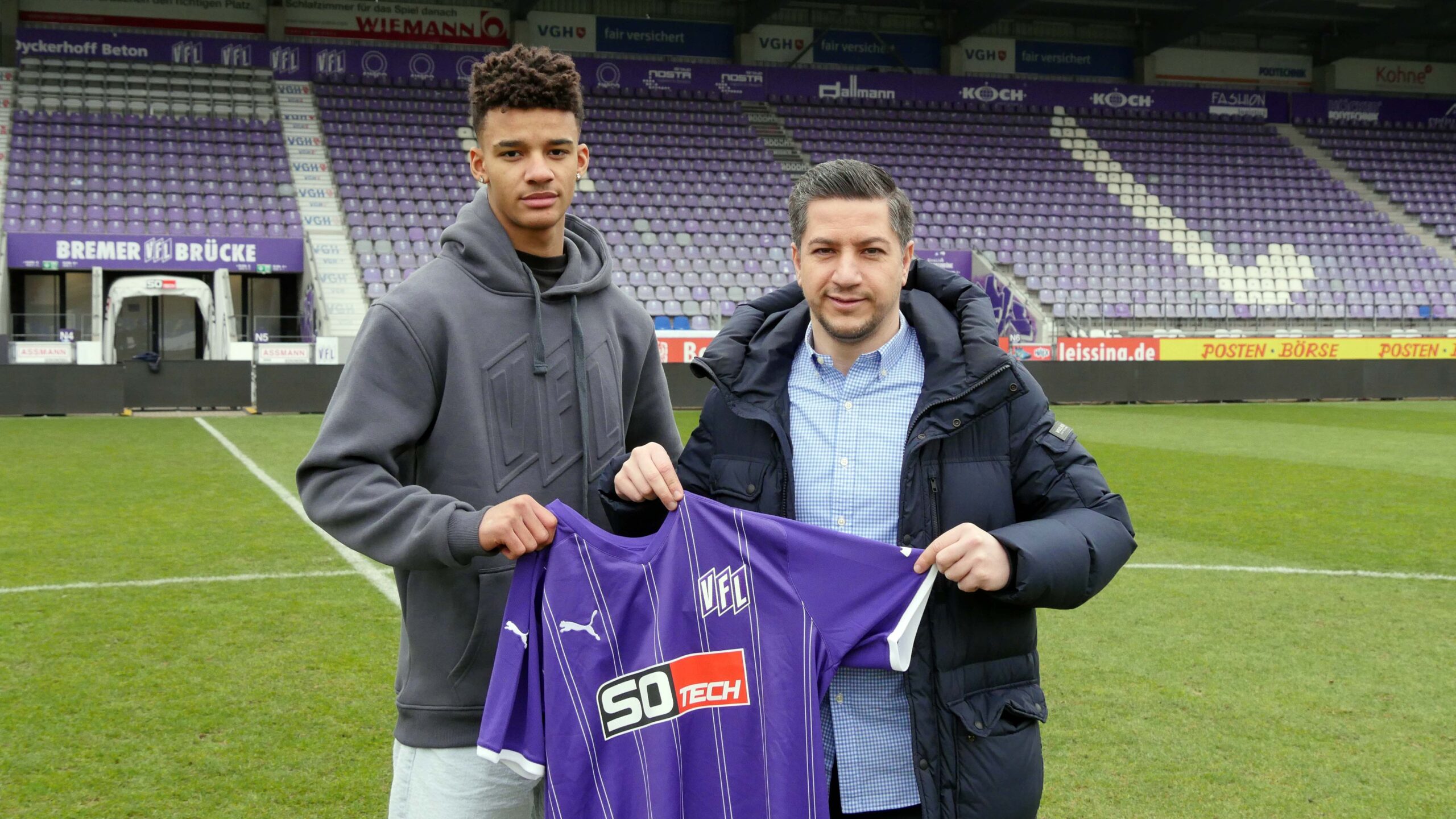 Emeka Oduah mit Osnabrücks Sportdirektor Amir Shapourzadeh. /Foto: VfL Osnabrück