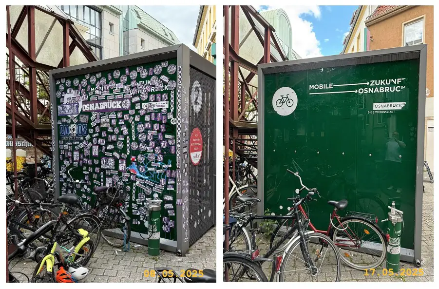 Es war das große Ärgernis zum Auftakt der Maiwoche: Kaum war die Osnabrücker Altstadt mit erheblichem Aufwand und Kosten gereinigt worden, tauchten plötzlich Hunderte – möglicherweise sogar Tausende – Aufkleber mit dem VfL-Logo und den Vereinsfarben im Innenstadtbereich auf. Die Stadt reagierte am Nikolaiort schnell und reinigte die Fahrradabstellanlage noch während der Maiwoche.