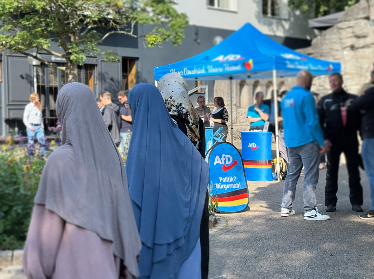 Über unerwartet viel Aufmerksamkeit durfte sich die Osnabrücker AfD am Samstagvormittag freuen. Gemessen an bisherigen Infoständen vor dem Haarmannsbrunnen waren mit etwa zwei Dutzend Vertretern deutlich mehr AfD-Mitglieder am Infostand vertreten, aber auch die Gruppe der Gegendemonstranten hatte aufgerüstet.