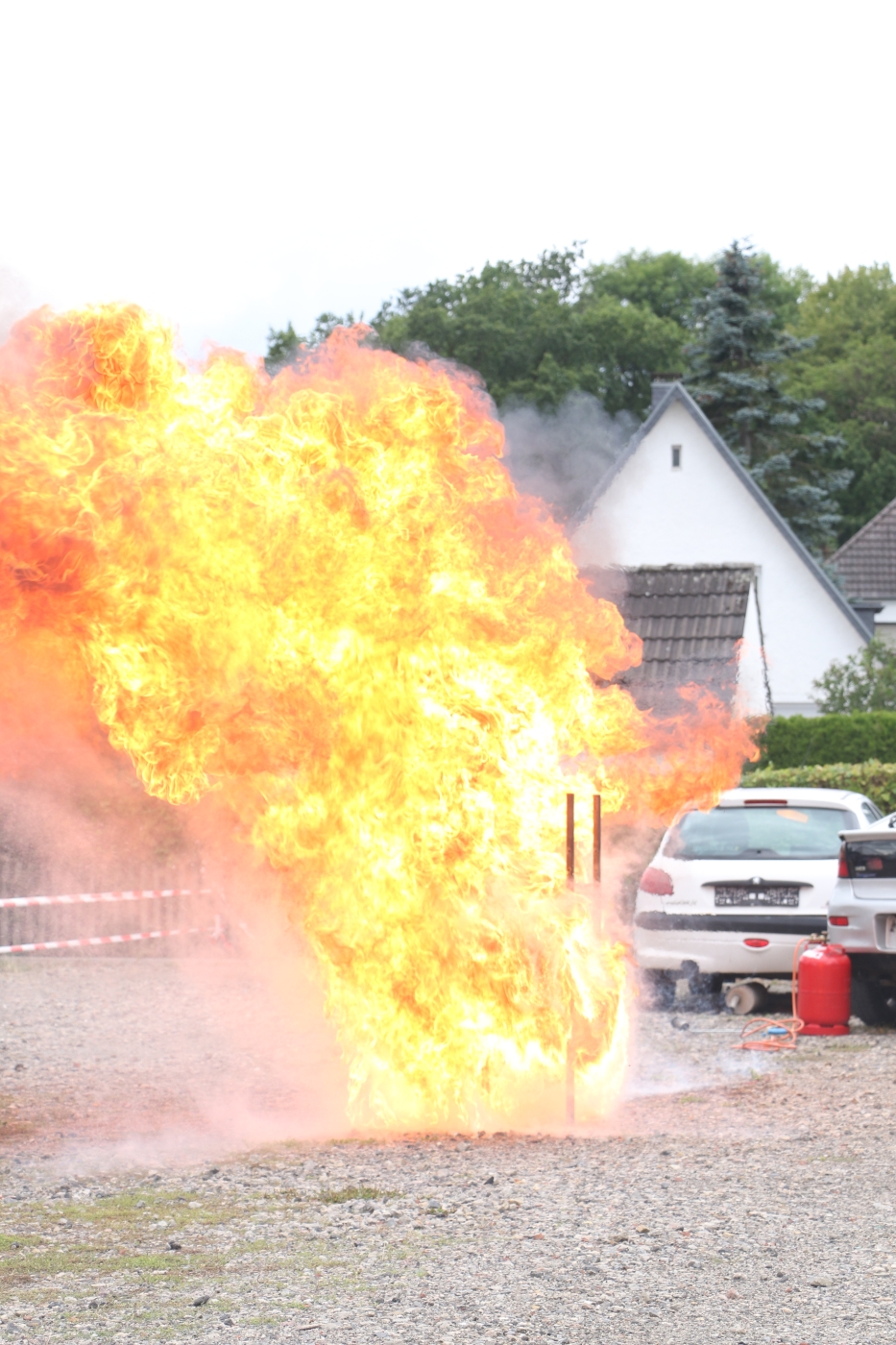 So waren diesmal als Partner die Feuerwehr Belm mit ihrer Drehleiter und der ASB mit einem Rettungswagen und einem Gerätewagen Sanität für Einsätze mit vielen Verletzten dabei. Ganz alltagsnah demonstrierte die Einsatzabteilung der Feuerwehr Voxtrup wieder einmal eine Fettexplosion, die durch Löschversuche mit Wasser in jedem Küchentopf entstehen kann. Wie man es stattdessen richtig macht, wurde auch gezeigt: Am einfachsten deckt man den brennenden Topf mit einem Deckel ab und lässt ihn abkühlen, bevor man den Deckel wieder abnimmt. Ansonsten besteht die Gefahr der erneuten Entzündung von heißem Fett. Darüber hinaus wurde das Vorgehen beim Retten von Personen und das Löschen von Bränden in Zimmern oder Wohnungen gezeigt. Die Atemschutzgeräteträger näherten sich im Anschluss auch den kleinsten Besuchern behutsam. Dies soll Ängste abbauen, damit Kinder im Ernstfall keinen zusätzlichen Schreck durch die Schutzanzüge und Masken der Brandbekämpfer bekommen.