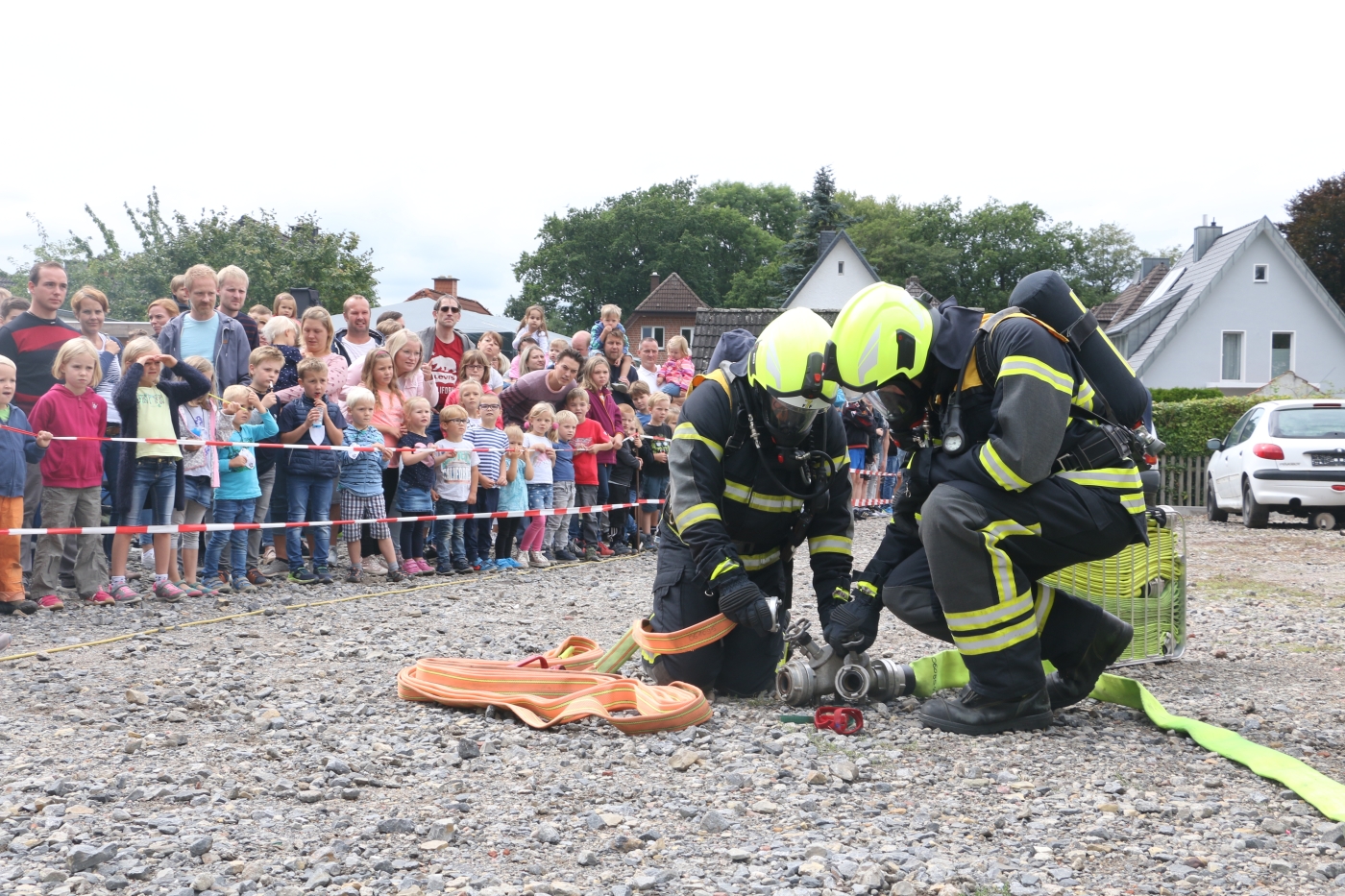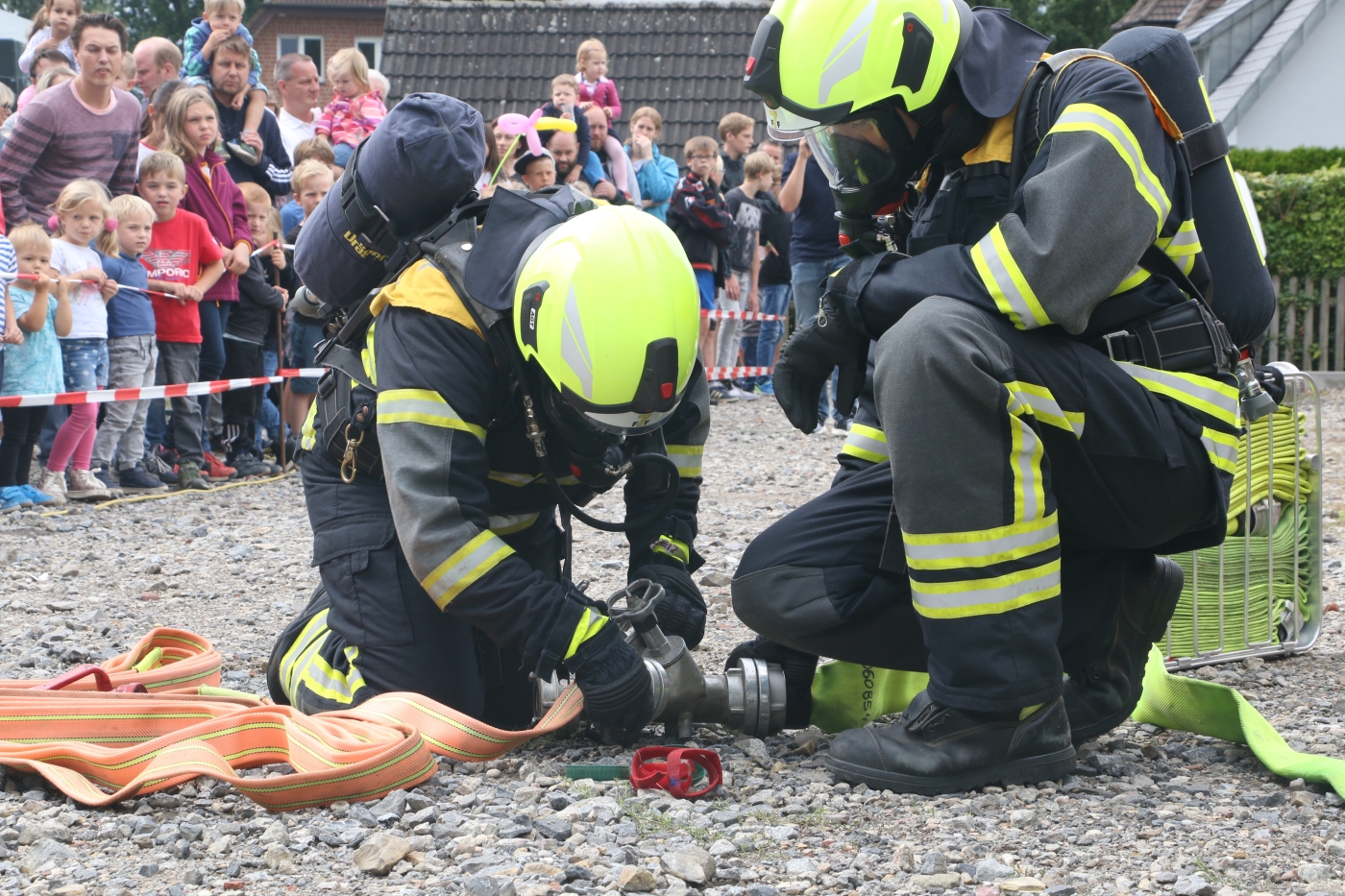 Dass sie mit dem Thema Feuerwehr auch Kinder begeistern können, stellte die Feuerwehr zugleich unter Beweis. Auf die Kleinen warteten gleich mehrere Herausforderungen. Mit Wasser aus dem Feuerwehrschlauch musste das fiktive Feuer eines Hauses in Kindergröße gelöscht werden. Beim Schlauchkegeln wurde der Umgang mit dem wohl wichtigsten Utensil geübt. Und als besonderes Highlight stand eine Rettungsübung an. Mit der Schaumstoffattrappe eines Atemschutzgerätes auf dem Rücken, absolvierten die Kinder einen Parcours. Am Ende musste ein Teddy aus seinem Häuschen befreit und aus der Gefahrenzone gebracht werden.