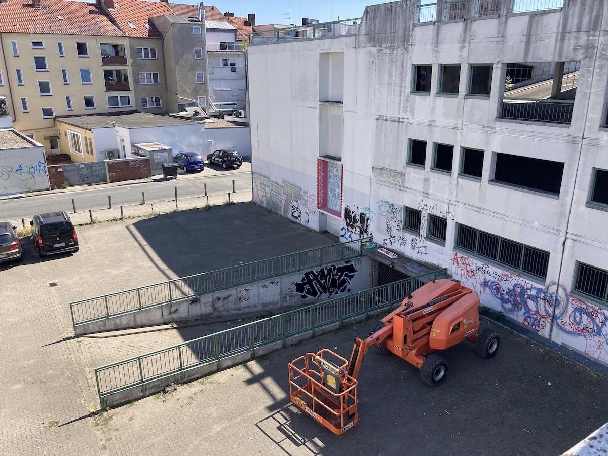 Der erste Hubsteiger steht bereit: Es kann losgehen an der Fassade des ehemaligen Wöhrl-Parkhauses. / Foto: Schulte